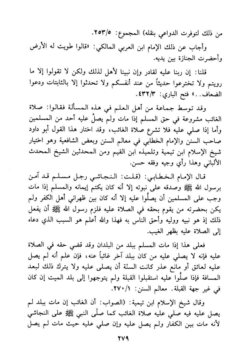 وقال شيخ الإسلام ابن تيمية: [الصواب: أن الغائب إن مات ببلد لم يصل عليه فيه صلي عليه صلاة الغائب كما صلى النبي صلى الله عليه وسلم على النجاشي لأنه مات بين الكفار ولم يصل عليه وإن صلي عليه حيث مات لم يصل
