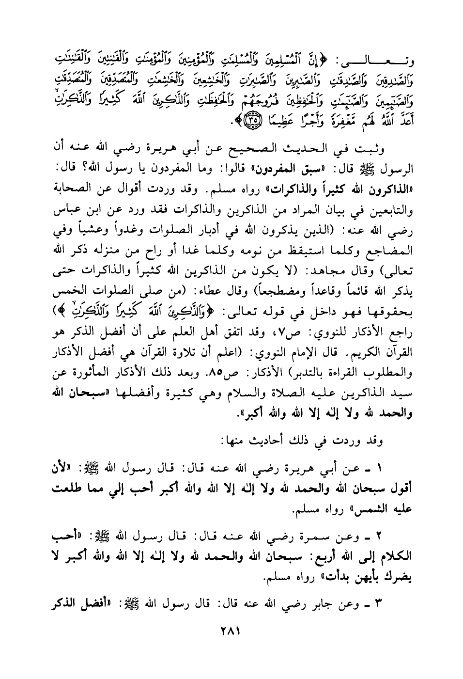 وثبت في الحديث الصحيح عن أبي هريرة رضي الله عنه أن الرسول صلى الله عليه وسلم قال: (سبق المفردون. قالوا: وما المفردون يا رسول الله؟ قال: الذاكرون الله كثيراً والذاكرات) رواه مسلم. وقد وردت أقوال عن الصحابة والتابعين في بيان المراد من الذاكرين والذاكرات فقد ورد عن ابن عباس رضي الله: [الذين يذكرون الله في أدبار الصلوات وغدواً وعشياً وفي المضاجع وكلما استيقظ من نومه وكلما غدا أو راح من منزله ذكر الله تعالى]، وقال مجاهد: [لا يكون من الذاكرين الله كثيراً والذاكرات حتى يذكر الله قائماً وقاعداَ ومضطجعاً]. وقال عطاء: [من صلى الصلوات الخمس بحقوقها فهو داخل في قوله تعالى: (وَالذَّاكِرِينَ) راجع الأذكار للنووي ص 7.