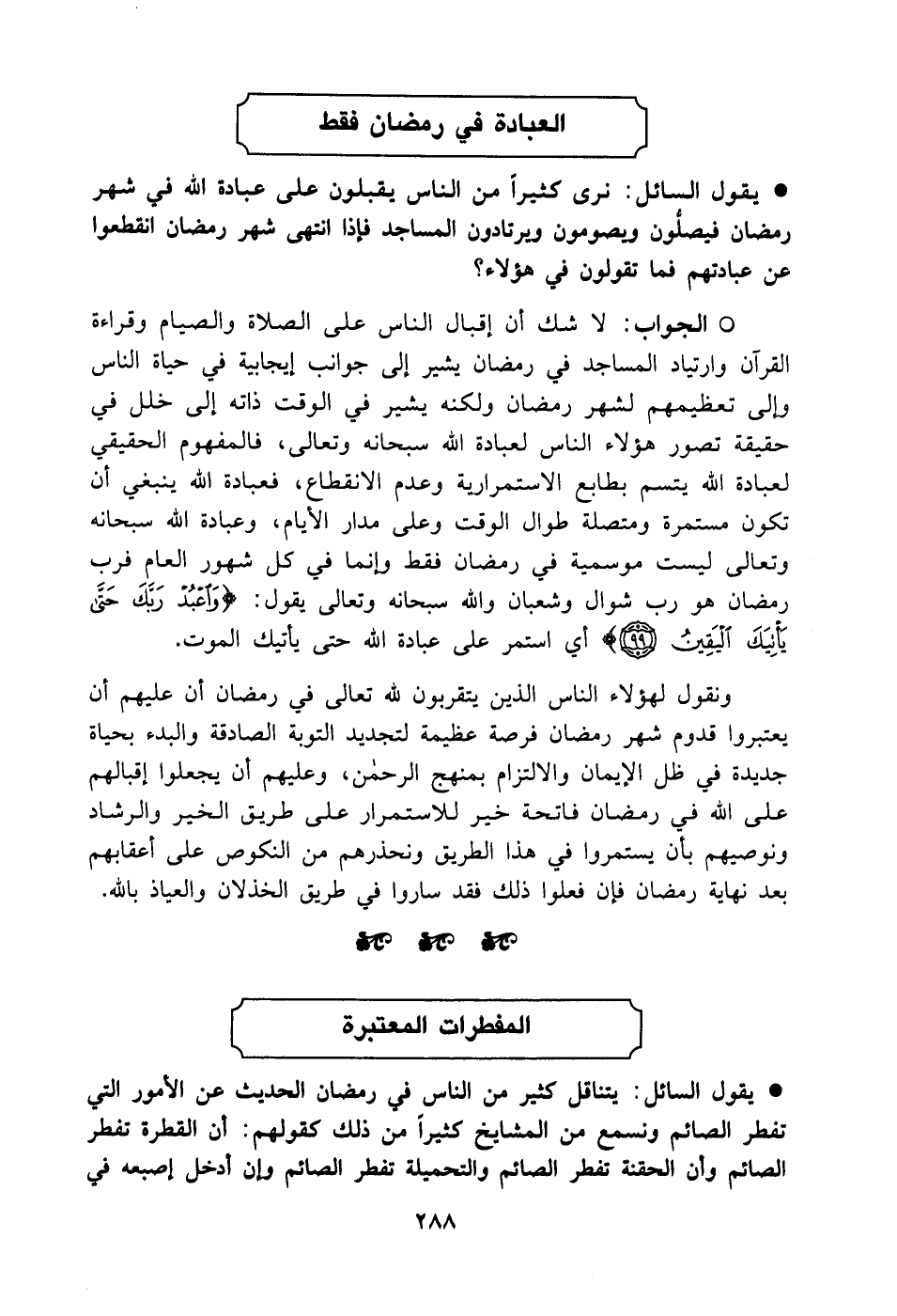 الجواب: لا شك أن إقبال الناس على الصلاة والصيام وقراءة القرآن وارتياد المساجد في رمضان يشير إلى جوانب إيجابية في حياة الناس وإلى تعظيمهم لشهر مضان ولكنه يشير في الوقت ذاته إلى خلل في حقيقة تصور هؤلاء الناس لعبادة الله سبحانه وتعالى فالمفهوم الحقيقي لعبادة الله يتسم بطابع الاستمرارية وعدم الانقطاع فعبادة الله ينبغي أن تكون مستمرة ومتصلة طوال الوقت وعلى مدار الأيام وعبادة الله سبحانه وتعالى ليست موسمية في رمضان فقط وإنما في كل شهور العام فرب رمضام هو رب شوال وشعبان، والله سبحانه وتعالى يقول: (وَاعْبُدْ رَبَّكَ حَتَّى يَأْتِيَكَ الْيَقِينُ) أي استمر على عبادة الله حتى يأتيك الموت.