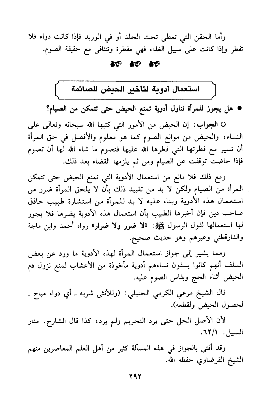 ومع ذلك فلا مانع من استعمال الأدوية التي تمنع الحيض حتى تتمكن المرأة من الصيام ولكن لا بد من تقييد ذلك بأن لا يلحق المرأة ضرر من استعمال هذه الأدوية وبناء عليه لا بد للمرأة من استشارة طبيب حاذق صاحب دين فإن أخبرها الطبيب بأن استعمال هذه الأدوية يضرها فلا يجوز لها استعمالها لقول الرسول صلى الله عليه وسلم: (لا ضرر ولا ضرار) رواه أحمد وابن ماجة والدارقطني وغيرهم وهو حديث صحيح.