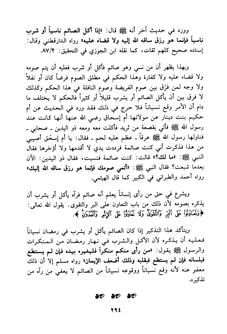 ورود في حديث آخر أنه صلى الله عليه وسلم قال: (إذا أكل الصائم ناسياً أو شرب ناسياً فإنما هو رزق ساقه الله إليه ولا قضاء عليه) رواه الدارقطني وقال: إسناده صحيح كلهم ثقات كما نقله ابن الجوزي في التحقيق 2/ 87.