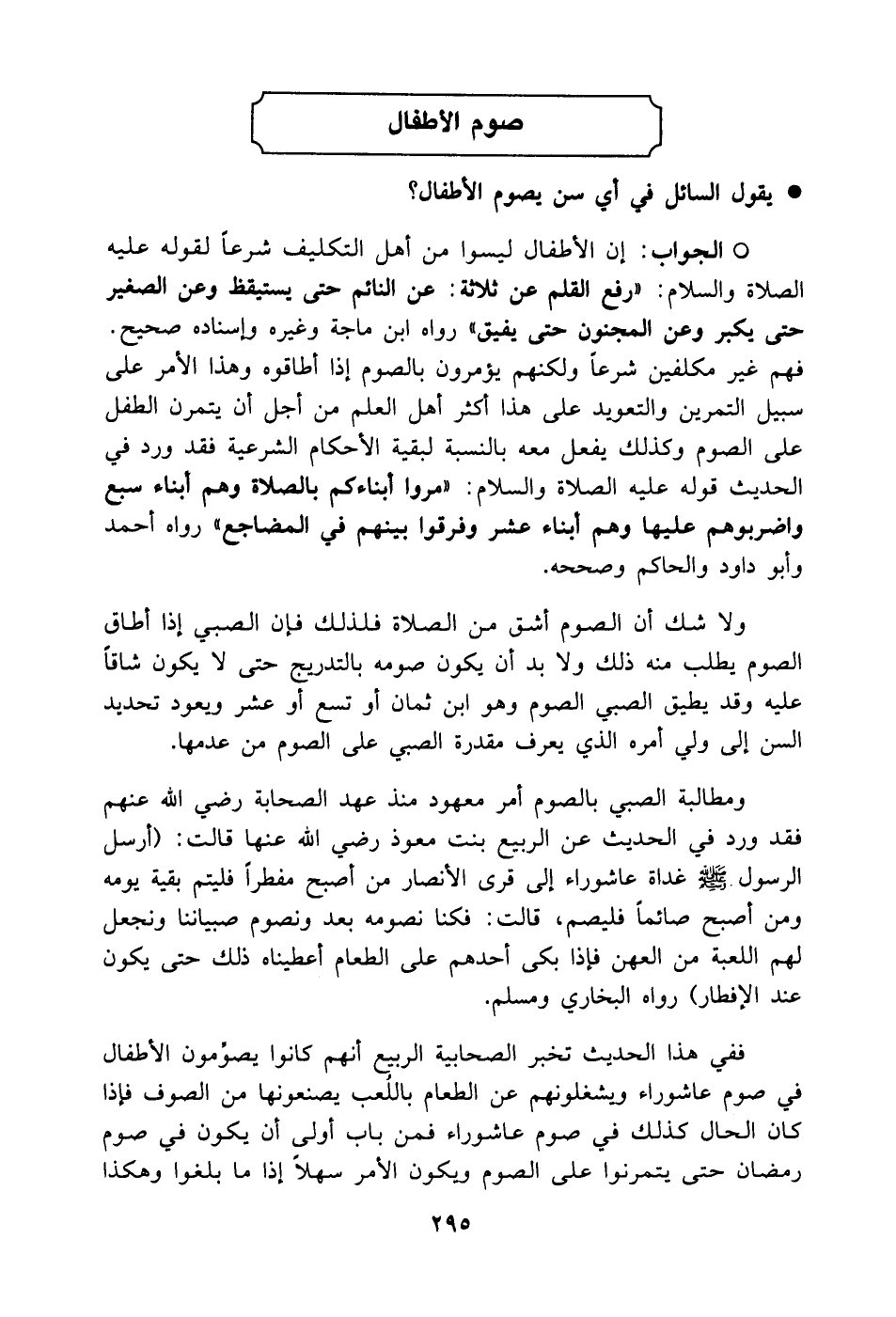 ولا شك أن الصوم أشق من الصلاة فلذلك فإن الصبي إذا أطاق الصوم يطلب منه ذلك ولا بد أن يكون صومه بالتدريج حتى لا يكون شاقاً عليه وقد يطيق الصبي الصوم وهو ابن ثمان أو تسع أو عشر ويعود تحديد السن إلى ولي أمره الذي يعرف مقدرة الصبي على الصوم من عدمها.