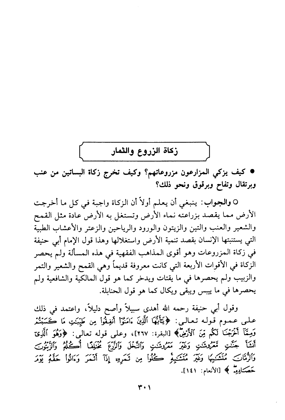 الجواب: ينبغي أن يعلم أولاً أن الزكاة واجبة في كل ما أخرجت الأرض مما يقصد بزراعته نماء الأرض وتستغل به الأرض عادة مثل القمح والشعير والعنب والتين والزيتون والورود والرياحين والزعتر والأعشاب الطبية التي يستنبتها الإنسان بقصد تنمية الأرض واستغلالها وهذا قول الإمام أبي حنيفة في زكاة المزروعات وهو أقوى المذاهب الفقهية في هذه المسألة ولم يحصر الزكاة في الأقوات الأربعة التي كانت معروفة قديماً وهي القمح والشعير والتمر والزبيب ولم يحصرها في ما يقتات ويدخر كما هو قول المالكية والشافعية ولم يحصرها في ما ييبس ويبقى ويكال كما هو قول الحنابلة.
