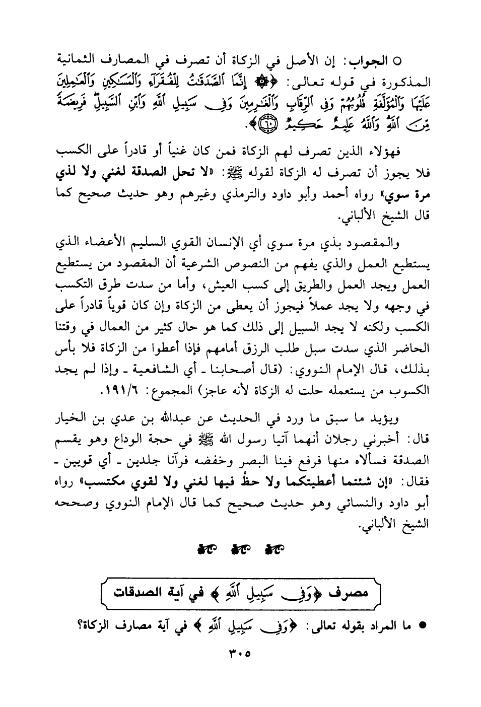 ويؤيد ما سبق ما رود في الحديث عن عبد الله بن عدي بن الخيار قال: (أخبرني رجلان أنهما أتيا رسول الله صلى الله عليه وسلم في حجة الوداع وهو يقسم الصدقة فسألاه منها فرفع فينا البصر وخفضه فرآنا جلدين - أي قويين - فقال: إن شئتما أعطيتكما ولا حظ فيها لغني ولا لقوي مكتسب) رواه أبو داود والنسائي وهو حديث صحيح كما قال الإمام النووي وصححه الشيخ الألباني.