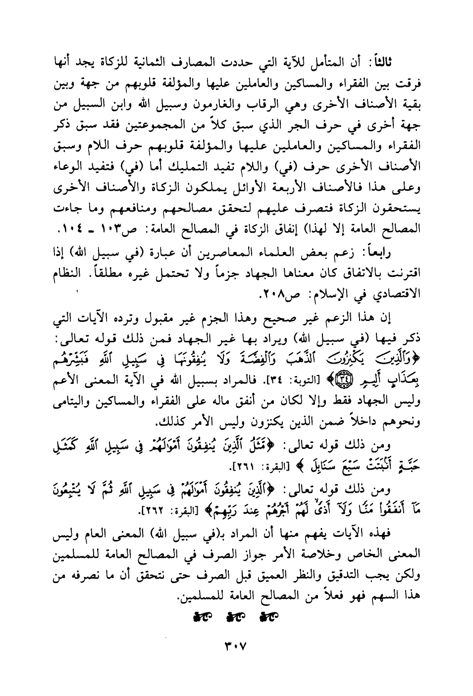 رابعاً: زعم بعض العلماء المعاصرين أن عبارة (وَفِي سَبِيلِ اللَّهِ) إذا اقترنت بالإنفاق كان معناها الجهاد جزماً ولا تحتمل غيره مطلقاً. النظام الاقتصادي في الإسلام ص 208.