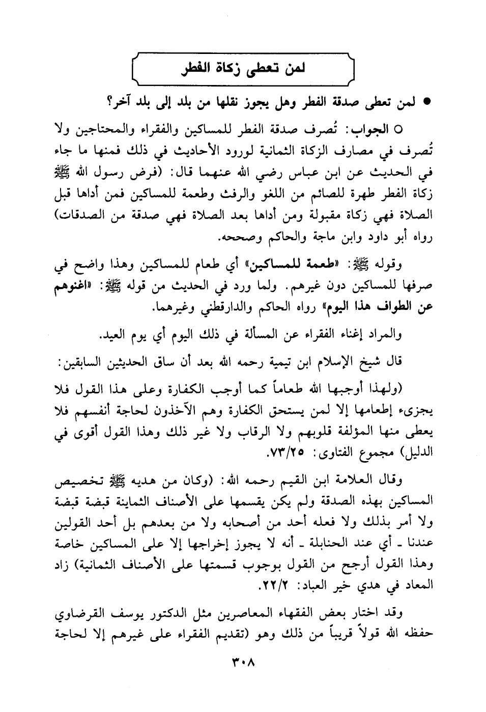 وقال العلامة ابن القيم رحمه الله: [وكان من هديه صلى الله عليه وسلم تخصيص المساكين بهذه الصدقة ولم يكن يقسمها على الأصناف الثمانية قبضة قبضة ولا أمر بذلك ولا فعله أحد من أصحابه ولا من بعدهم بل أحد القولين عندنا - أي عند الحنابلة - إنه لا يجوز أخراجها إلا على المساكين خاصة وهذا القول أرجح من القول بوجوب قسمتها على الأصناف الثمانية] زاد لمعاد في هدي خير العباد 2/ 22.