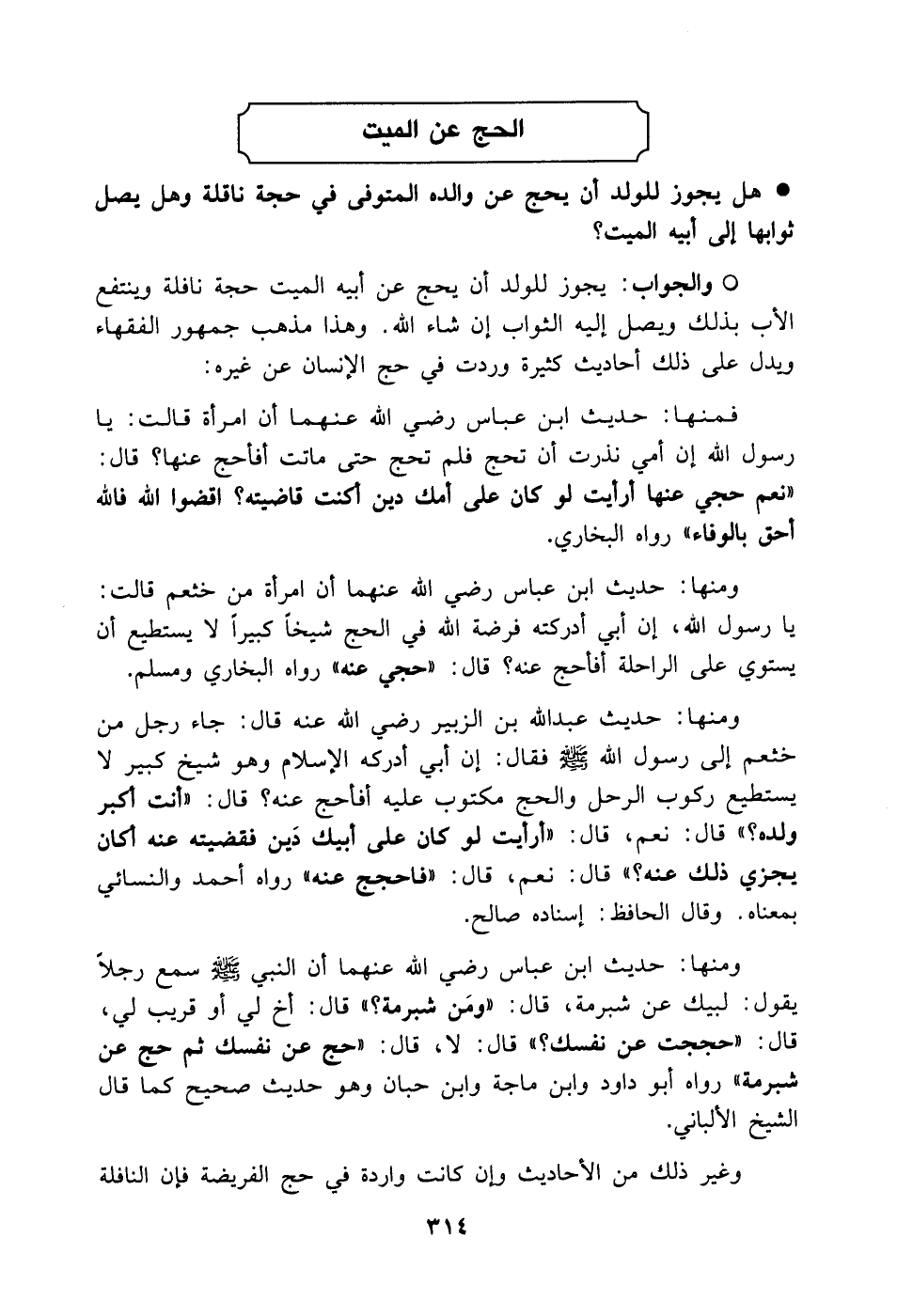 ومنها حديث عبد الله بن الزبير رضي الله عنه قال: (جاء رجل من خثعم إلى رسول الله صلى الله عليه وسلم فقال: إن أبي أدركه الإسلام وهو شيخ كبير لا يستطيع ركوب الرحل والحج مكتوب عليه أفأحج عنه؟ قال: أنت أكبر ولده؟ قال: نعم. قال: أرأيت لو كان على أبيك دين فقضيته أكان يجزي ذلك عنه؟ قال: نعم. قال: فاحجج عنه) رواه أحمد والنسائي بمعناه، وقال الحافظ: إسناده صالح.