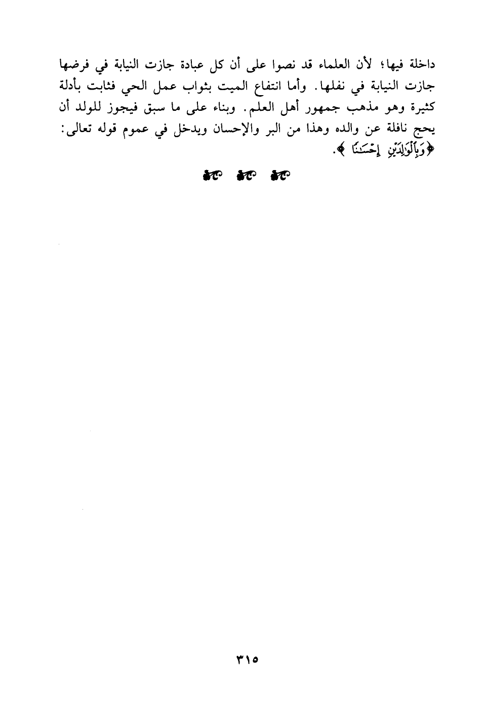 داخلة فيها لأن العلماء قد نصوا على أن كل عبادة جازت النيابة في فرضها جازت النيابة في نفلها. وأما انتفاع الميت بثواب عمل الحي فثابت بأدلة كثيرة وهو مذهب جمهور أهل العلم. وبناء على ما سبق فيجوز للولد أن يحج نافلة عن والده وهذا من البر والإحسان ويدخل في عموم قوله تعالى: (وَبِالْوَالِدَيْنِ إِحْسَانًا).