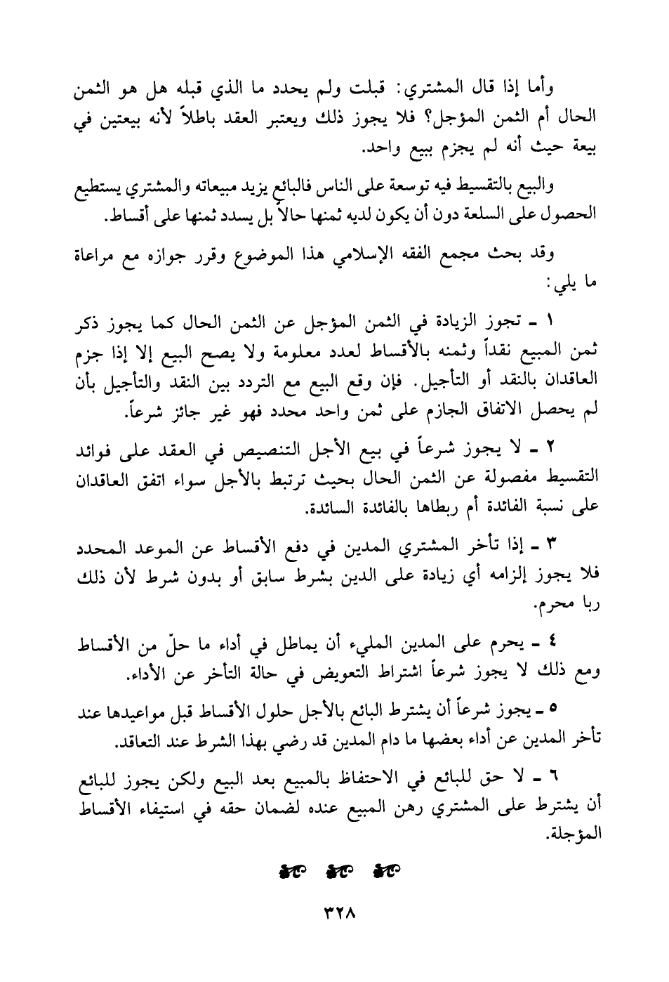 .2. لا يجوز شرعاً في بيع الأجل التنصيص في العقد على فوائد التقسيط مفصولة عن الثمن الحال بحيث ترتبط بالأجل سواء اتفق العاقدان على نسبة الفائدة أم ربطاها بالفائدة السائدة