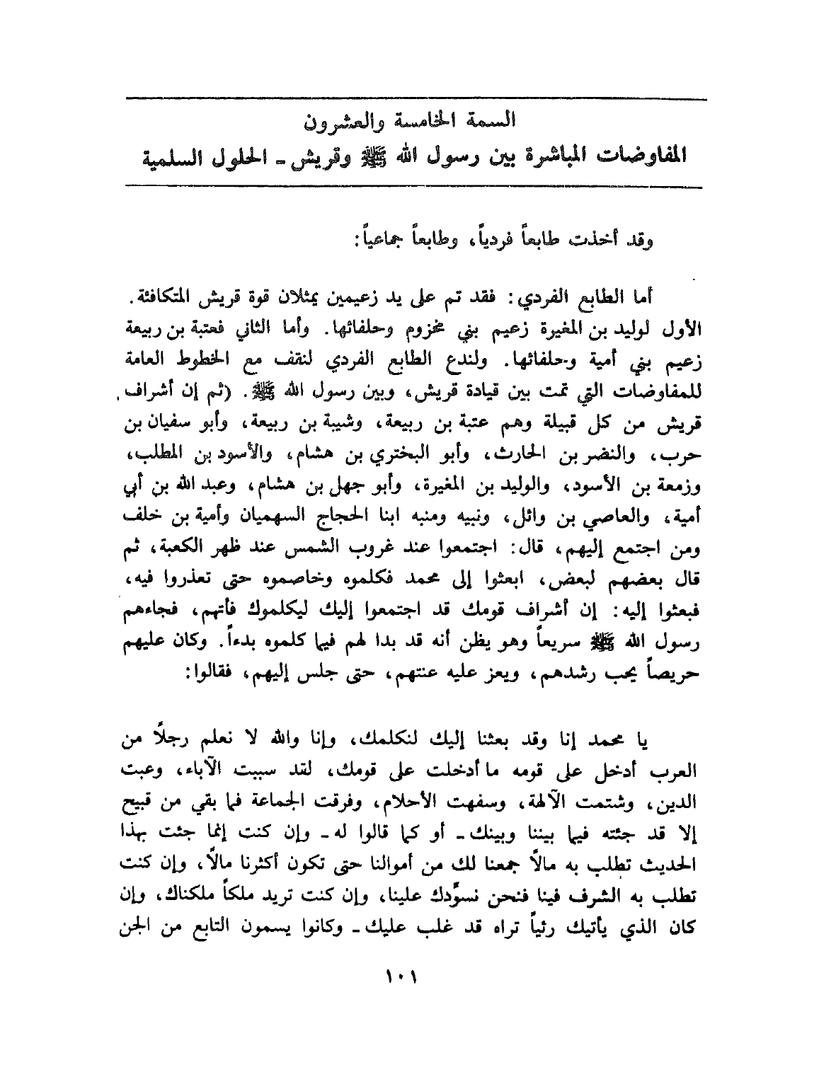 الأول الوليد بن المغيرة زعيم بني مخزوم وحلفائها. وأما الثاني فعتبة بن ربيعة زعيم بني أمية وجلفائها. ولندع الطابع الفردي لنقف مع الخطوط العامة للمفاوضات التي تمت بين قيادة قريش، وبين رسول الله - صلى الله عليه وسلم -. (ثم إن أشراف قريش من كل قبيلة وهم عتبة بن ربيعة، وشيبة بن ربيعة، وأبو سفيان بن حرب، والنضر بن الحارث، وأبو البختري بن هشام، والأسود بن المطلب، وزمعة بن الأسود، والوليد بن المغيرة، وأبو جهل بن هشام، وعبد الله بن أبي أمية، والعاصي بن وائل، ونبيه ومنبه ابنا الحجاج السهميان وأمية بن خلف ومن اجتمع إليهم، قال: اجتمعوا عند غروب الشمس عند ظهر الكعبة، ثم قال بعضهم لبعض، ابعثوا إلى محمد فكلموه وخاصموه حتى تعذروا فيه، فبعثوا إليه: أن أشراف قومك قد اجتمعوا إليك ليكلموك فأتهم، فجاءهم رسول الله - صلى الله عليه وسلم - سريعا وهو يظن أنه قد بدا لهم فيما كلموه بدءا. وكان عليهم حريصا يحب رشدهم، ويعز عليه عنتهم، حتى جلس إليهم، فقالوا: