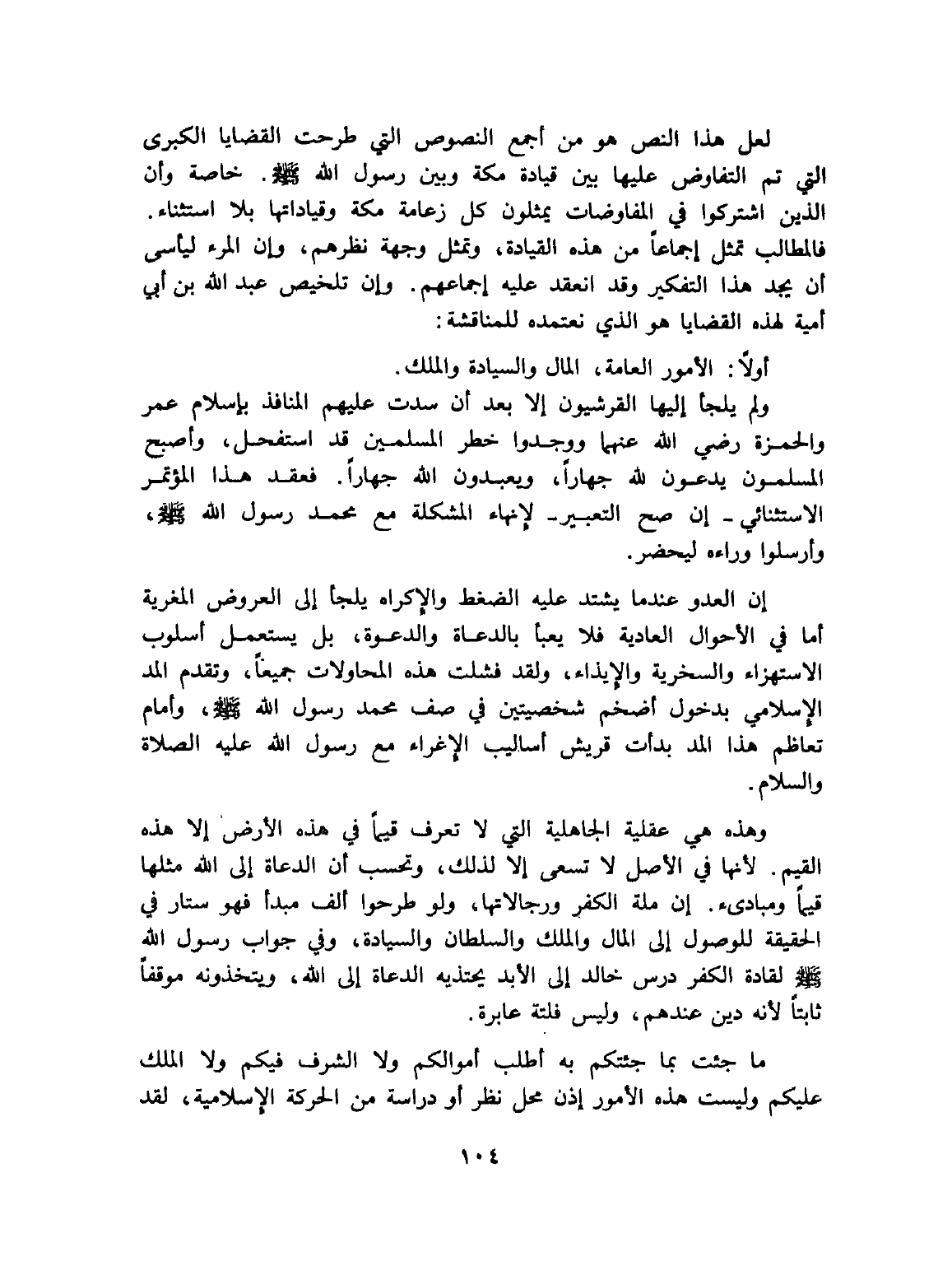 لعل هذا النص هو من أجمع النصوص التي طرحت القضايا الكبرى التي تم التفاوض عليها بين قيادة مكة وبين رسول الله - صلى الله عليه وسلم -. خاصة وأن الذين اشتركوا في المفاوضات يمثلون كل زعامة مكة وقياداتها بلا استثناء.