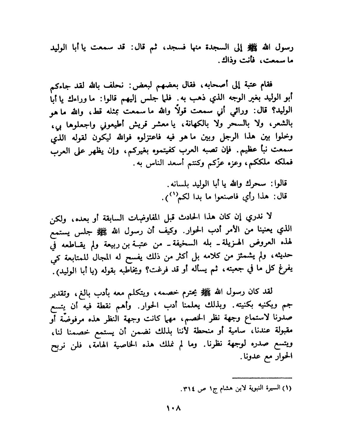 لا ندري إن كان هذا الحادث قبل المفاوصات السابقة أو بعده، ولكن الذي يعنينا من الأمر أدب الحوار. وكيف أن رسول الله - صلى الله عليه وسلم - جلس يستمع لهذه العروض الهزيلة - بله السخيفة - من عتبة بن ربيعة ولم يقاطعه في حديثه، ولم يشمئز من كلامه بل أكثر من ذلك يفسح له المجال للمتابعة كي يفرغ كل ما في جعبته، ثم يسأله أو قد فرغت؟ ويخاطبه بقوله (يا أبا الوليد).