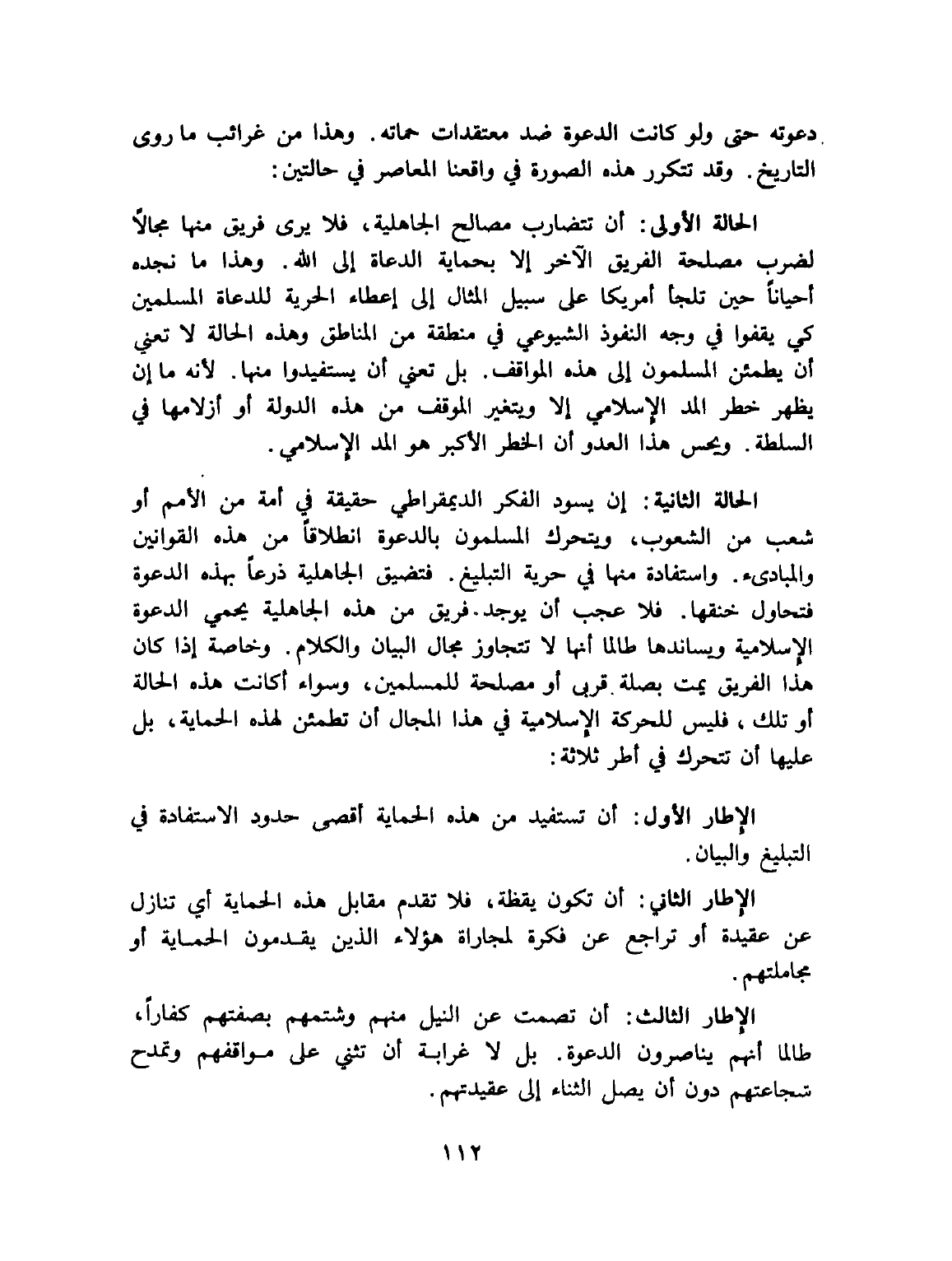 الحالة الثانية: أن يسود الفكر الديمقراطي حقيقة في أمة من الأمم أو شعب من الشعوب، ويتحرك المسلمون بالدعوة انطلاقا من هذه القوانين والمبادىء. واستفادة منها في حرية التبليغ. فتضيق الجاهلية ذرعا بهذه الدعوة فتحاول خنقها. فلا عجب أن يوجد فريق من هذه الجاهلية يحمي الدعوة الإسلامية ويساندها طالما أنها لا تتجاوز مجال البيان والكلام. وخاصة إذا كان هذا الفريق يمت بصلة قربى أو مصلحة للمسلمين، وسواء أكانت هذه الحالة أو تلك، فليس للحركة الإسلامية في هذا المجال أن تطمئن لهذه الحماية، بل عليها أن تتحرك في أطر ثلاثة: