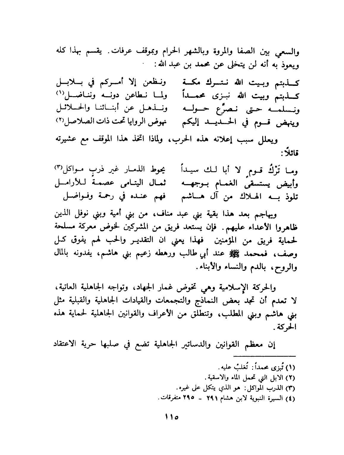 والسعي بين الصفا والمروة وبالشهر الحرام وبموقف عرفات. يقسم بهذا كله ويعوذ به أنه لن يتخلى عن محمد بن عبد الله: