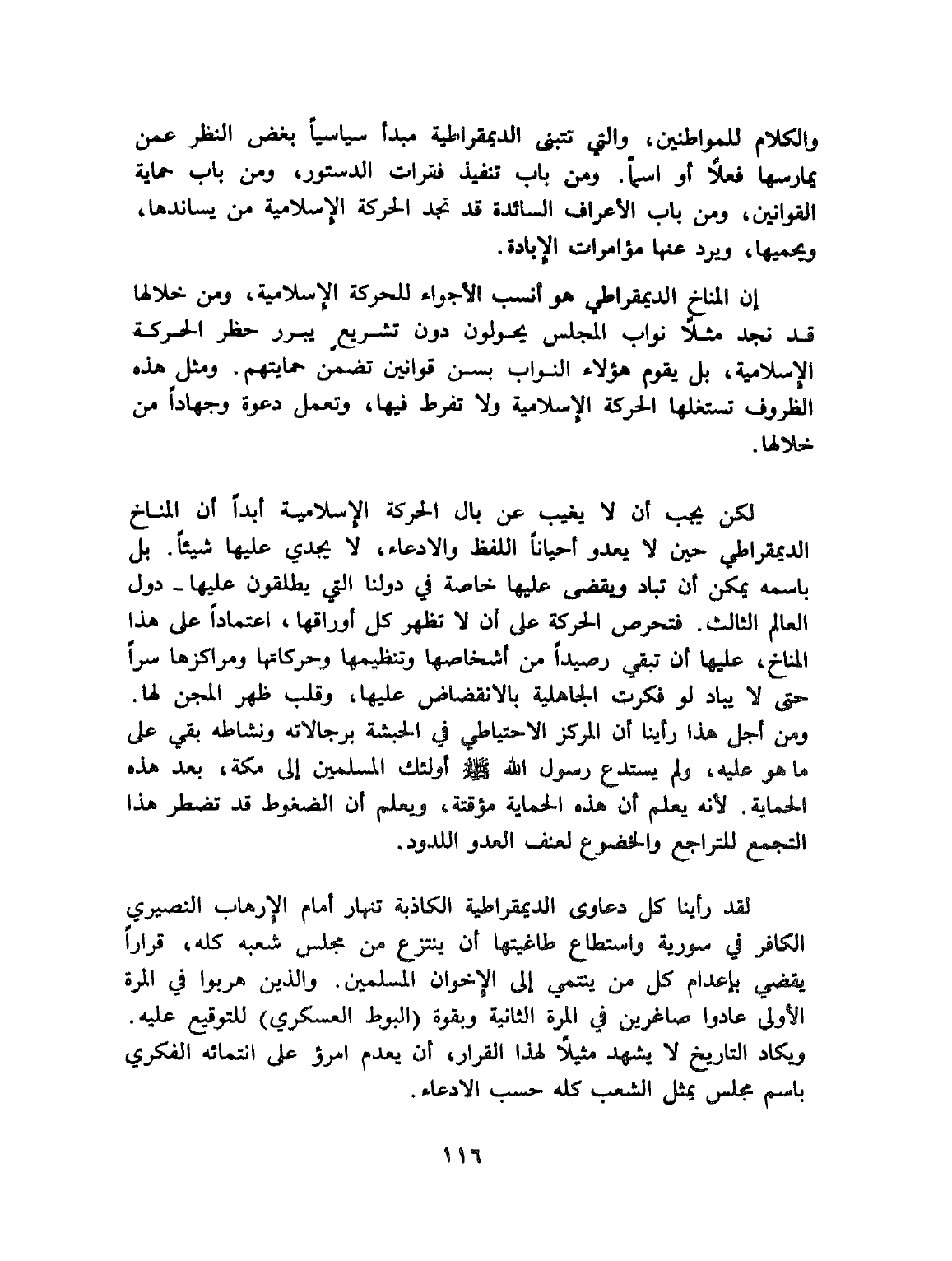 إن المناخ الديمقراطي هو أنسب الأجواء للحركة الإسلامية، ومن خلالها قد نجد مثلا نواب المجلس يحولون دون تشريع يبرر حظر الحركة الإسلامية، بل يقوم هؤلاء النواب بسن قوانين تضمن حمايتهم. ومثل هذه الظروف تستغلها الحركة الإسلامية ولا تفرط فيها، وتعمل دعوة وجهادا من خلالها.