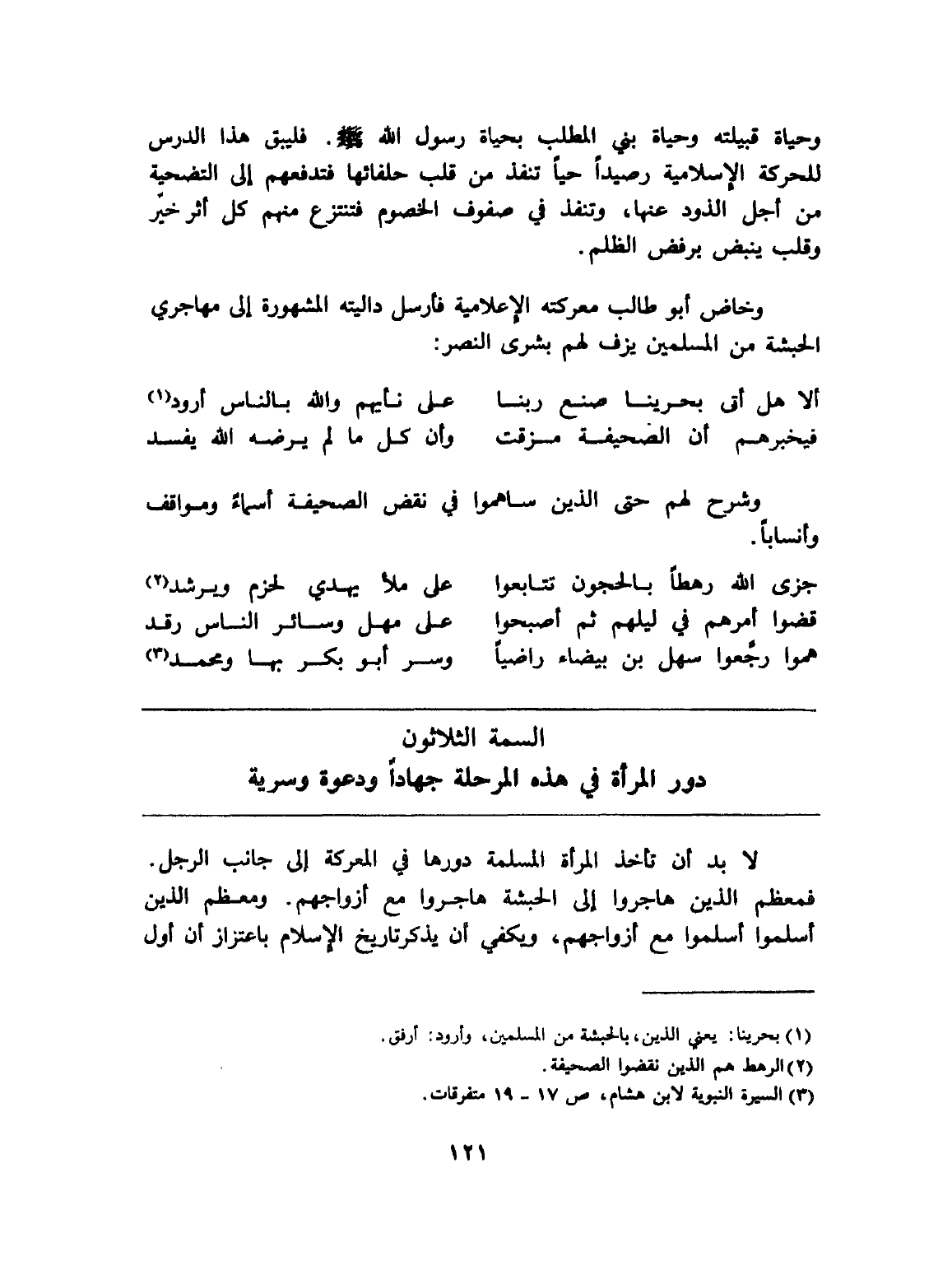 وحياة قبيلته وحياة بني المطلب بحياة رسول الله - صلى الله عليه وسلم -. فليبق هذا الدرس للحركة الإسلامية رصيدا حيا تنفذ من قلب حلفائها فتدفعهم إلى التضحية من أجل الذود عنها، وتنفذ في صفوف الخصوم فتننتزع منهم كل أثر خير وقلب ينبض برفض الظلم.
