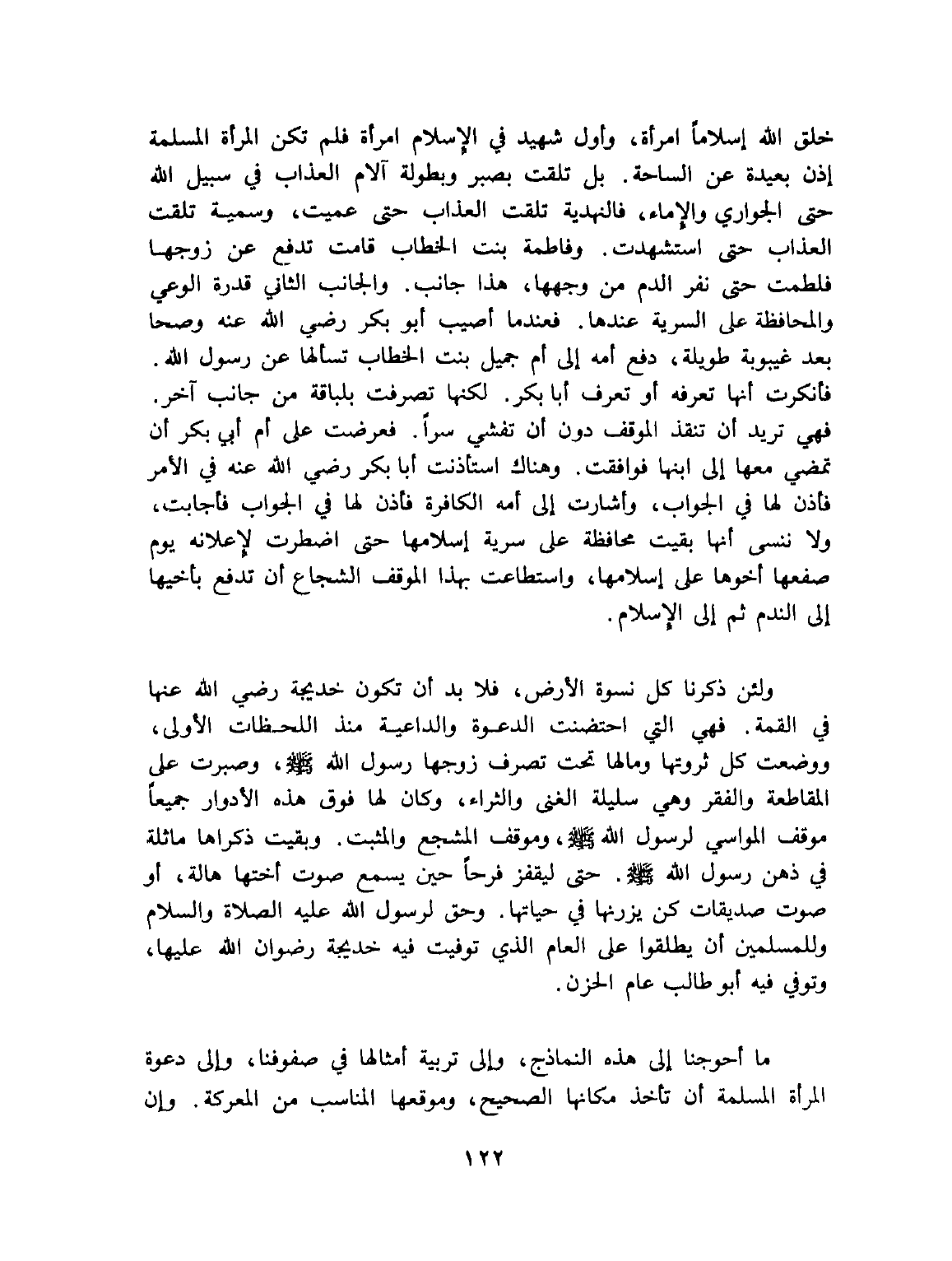 خلق الله إسلاما امرأة، وأول شهيد في الإسلام امرأة فلم تكن المرأة المسلمة إذن بعيدة عن الساحة. بل تلقت بصبر وبطولة آلام العذاب في سبيل الله حتى الجواري والإماء، فالنهدية تلقت العذاب حتى عميت، وسمية تلقت العذاب حتى استشهدت. وفاطمة بنت الخطاب قامت تدفع عن زوجها فلطمت حتى نفر الدم من وجهها، هذا جانب. والجانب الثاني قدرة الوعي والمحافظة على السرية عندها. فعندما أصيب أبو بكر رضي الله عنه وصحا بعد غيبوبة طويلة، دفع أمه إلى أم جميل بنت الخطاب تسألها عن رسول الله. فأنكرت أنها تعرفه أو تعرف أبا بكر. لكنها تصرفت بلباقة من جانب آخر. فهي تريد أن تنقذ الموقف دون أن تفشي سرا. فعرضت على أم أبي بكر أن تمضي معها إلى ابنها فوافقت. وهناك استأذنت أبا بكر رضي الله عنه في الأمر فأذن لها في الجواب، وأشارت إلى أمه الكافرة فأذن لها في الجواب فأجابت، ولا ننسى أنها بقيت محافظة على سرية إسلامها حتى اضطرت لإعلانه يوم صفعها أخوها على إسلامها، واستطاعت بهذا الموقف الشجاع أن تدفع بأخيها إلى الندم ثم إلى الإسلام.