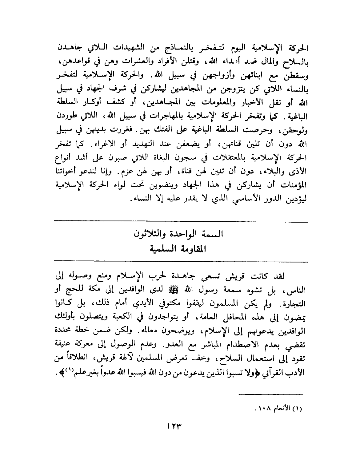 الحركة الإسلإمية اليوم لتفخر بالنماذج من الشهيدات اللاتي جاهدن بالسلاح والمال ضد أعداء الله، وقتلن الأفراد والعشرات وهن في قواعدهن، وسقطن مع أبنائهن وأزواجهن في سبيل الله. والحركة الإسلامية لتفخر بالنساء اللاتي كن يتزوجن من المجاهدين ليشاركن في شرف الجهاد في سبيل الله أو نقل الأخبار والمعلومات بين المجاهدين، أو كشف أوكار السلطة الباغية. كما وتفخر الحركة الإسلامية بالمهاجرات في سبيل الله، اللاتي طوردن ولوحقن، وحرصت السلطة الباغية على الفتك بهن. فغررت بدينهن في سبيل الله دون أن تلين قناتهن، أو يضعفن عند التهديد أو الإغراء. كما تفخر الحركة الإسلامية بالمعتقلات في سجون البغاة اللاتي صبرن على أشد أنواع الأذى والبلاء، دون أن تلين لهن قناة، أو يهن لهن عزم. وإنا لندعو أخواتنا المؤمنات أن يشاركن في هذا الجهاد وينضوين تحت لواء الحركة الإسلامية ليؤدين الدور الأساسي الذي لا يقدر عليه إلا النساء.