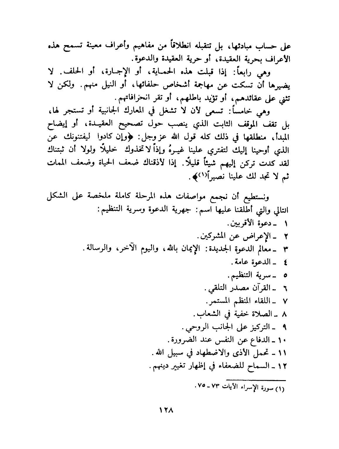 وهي خامسا: تسعى لأن لا تشغل في المعارك الجانبية أو تستجر لها، بل تقف الموقف الثابت الذي ينصب حول تصحيح العقيدة، أو إيضاح المبدأ، منطلقها في ذلك كله قول الله عز وجل: {وإن كادوا ليفتنونك عن الذي أوحينا إليك لتفتري علينا غيره وإذا لاتخذوك خليلا ولولا أن ثبتناك لقد كدت تركن اليهم شيئا قليلا إذا لأذقناك ضعف الحياة وضعف الممات ثم لا تجد لك علينا نصيرا (¬1)}.
