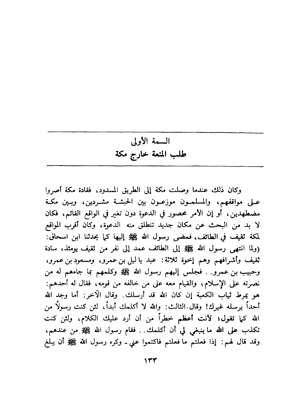 وكان ذلك عندما وصلت مكة إلى الطريق المسدود، فقادة مكة أصروا على مواقفهم، والمسلمون موزعون بين الحبشة مشردين، وبين مكة مضطهدين، أو أن الأمر محصور في الدعوة دون تغير في الواقع القائم، فكان لا بد من البحث عن مكان جديد تنطلق منه الدعوة، وكان أقرب المواقع لمكة ثقيف في الطائف، فمضى رسول الله - صلى الله عليه وسلم - إليها كما يحدثنا ابن إسحاق: (ولما انتهى رسول الله - صلى الله عليه وسلم - إلى الطائف عمد إلى نفر من ثقيف يومئذ، سادة ثقيف وأشرافهم وهم إخوة ثلاثة: عبد يا ليل بن عمرو، ومسعود بن عمرو، وحبيب بن عمرو .. فجلس إليهم رسول الله - صلى الله عليه وسلم - وكلمهم بما جاءهم له من نصرته على الإسلام، والقيام معه على من خالفه من قومه، فقال له أحدهم: هو يمرط ثياب الكعبة إن كان الله قد أرسلك. وقال الآخر: أما وجد الله أحدا يرسله غيرك! وقال. الثالث: والله لا أكلمك أبدا، لئن كنت رسولا من الله كما تقول، لأنت أعظم خطرا من أن أرد عليك الكلام، ولئن كنت تكذب على الله ما ينبغي لي أن أكلمك .. فقام رسول الله - صلى الله عليه وسلم - من عندهم، وقد قال لهم: إذا فعلتم ما فعلتم فاكتموا عني - وكره رسول الله - صلى الله عليه وسلم - أن يبلغ