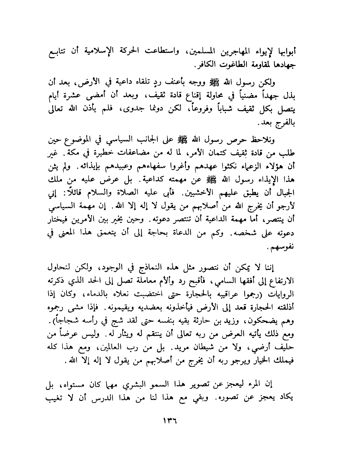 ونلاحظ حرص رسول الله - صلى الله عليه وسلم - على الجانب السياسي في الموضرع حين طلب من قادة ثقيف كتمان الأمر، لما له من مضاعفات خطيرة في مكة. غير أن هؤلاء الزعماء نكثوا عهدهم وأغروا سفهاءهم وعبيدهم بإيذائه. ولم يثن هذا الإيذاء رسول الله - صلى الله عليه وسلم - عن مهمته كداعية. بل عرض عليه من ملك الجبال أن يطبق عليهم الأخشبين. فأبى عليه الصلاة والسلام قائلا: إني لأرجو أن يخرج الله من أصلابهم من يقول لا إله إلا الله. إن مهمة السياسي أن ينتصر، أما مهمة الداعية أن تنتصر دعوته. وحين يخير بين الأمرين فيختار دعوته على شخصه. وكم من الدعاة بحاجة إلى أن يتعمق هذا المعنى في نفوسهم.