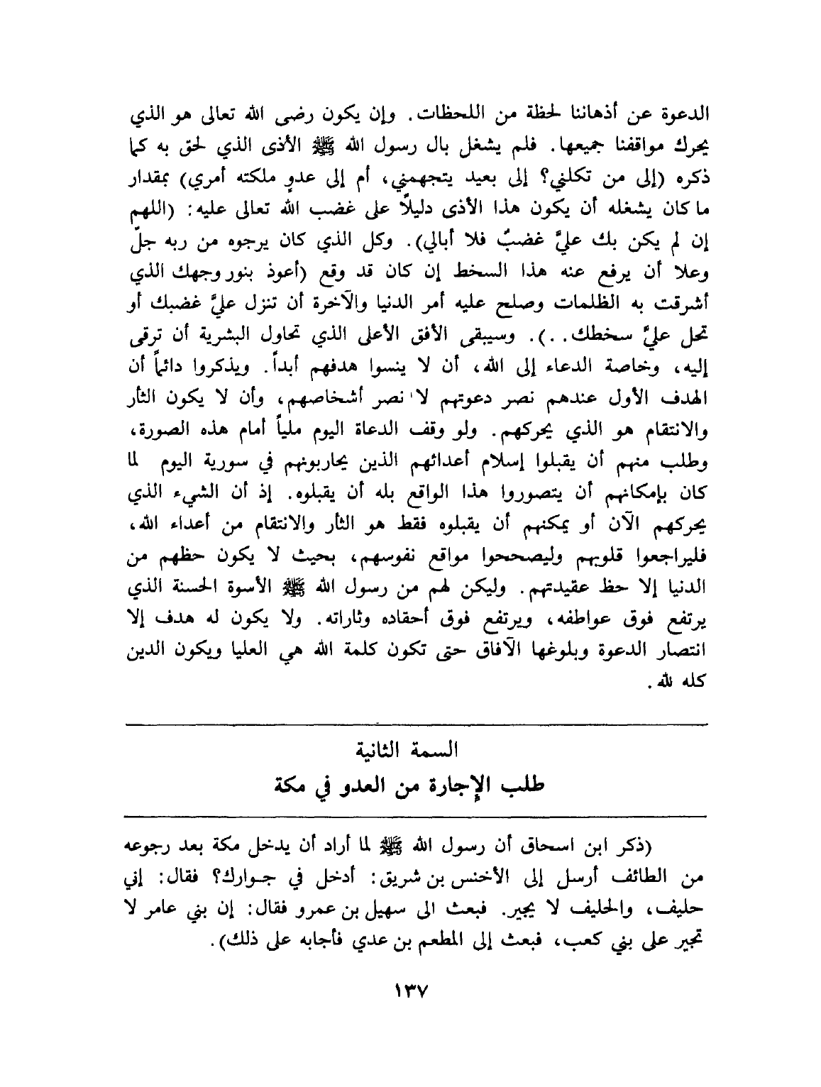 الدعوة عن أذهاننا لحظة من اللحظات. وإن يكون رضى الله تعالى هو الذي يحرك مواقفنا جميعها. فلم يشغل بال رسول الله - صلى الله عليه وسلم - الأذى الذي لحق به كما ذكره (إلى من تكلني؟ إلى بعيد يتجهمني، أم إلى عدو ملكته أمري) بمقدار ما كان يشغله أن يكون هذا الأذى دليلا على غضب الله تعالى عليه: (اللهم إن لم يكن بك علي غضب فلا أبالي). وكل الذي كان يرجوه من ربه جل وعلا أن يرفع عنه هذا السخط إن كان قد وقع (أعوذ بنور وجهك الذي أشرقت به الظلمات وصلح عليه أمر الدنيا والآخرة أن تنزل علي غضبك أو يحل علي سخطك ..). وسيبقى الأفق الأعلى الذي تحاول البشرية أن ترقى إليه، وخاصة الدعاة إلى الله، أن لا ينسوا هدفهم أبدا. ويذكروا دائما أن الهدف الأول عندهم هو نصر دعوتهم لا نصر أشخاصهم، وأن لا يكون الثأر والانتقام هو الذي يحركهم. ولو وقف الدعاة اليوم مليا أمام هذه الصورة، وطلب منهم أن يقبلوا إسلام أعدائهم الذين يحاربونهم في سورية اليوم لما كان بإمكانهم أن يتصوروا هذا الواقع بله أن يقبلوه. إذ أن الشيء الذي يحركهم الآن أو يمكنهم أن يقبلوه فقط هو الثأر والانتفام من أعداء الله، فليراجعوا قلوبهم وليصححوا مواقع نفوسهم، بحيث لا يكون حظهم من الدنيا إلا حظ عقيدتهم. وليكن لهم من رسول الله - صلى الله عليه وسلم - الأسوة الحسنة الذي يرتفع فوق عواطفه، ويرتفع فوق أحقاده وثاراته. ولا يكون له هدف إلا انتصار الدعوة وبلوغها الآفاق حتى تكون كلمة الله هي العليا ويكون الدين كله لله.