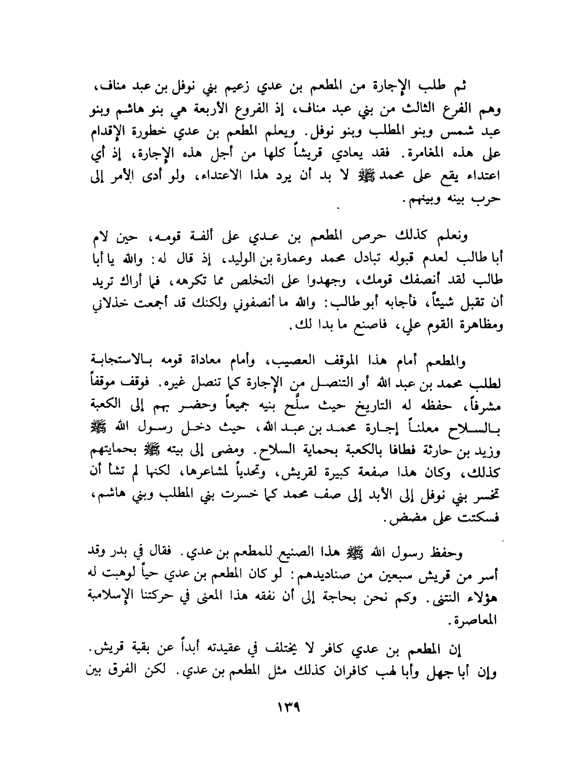 وحفظ رسول الله - صلى الله عليه وسلم - هذا الصنيع للمطعم بن عدي. فقال في بدر وقد أسر من قريش سبعين من صناديدهم: لو كان المطعم بن عدي حيا لوهبت له هؤلاء النتنى. وكم نحن بحاجة إلى أن نفقه هذا المعنى في حركتنا الإسلامية المعاصرة.