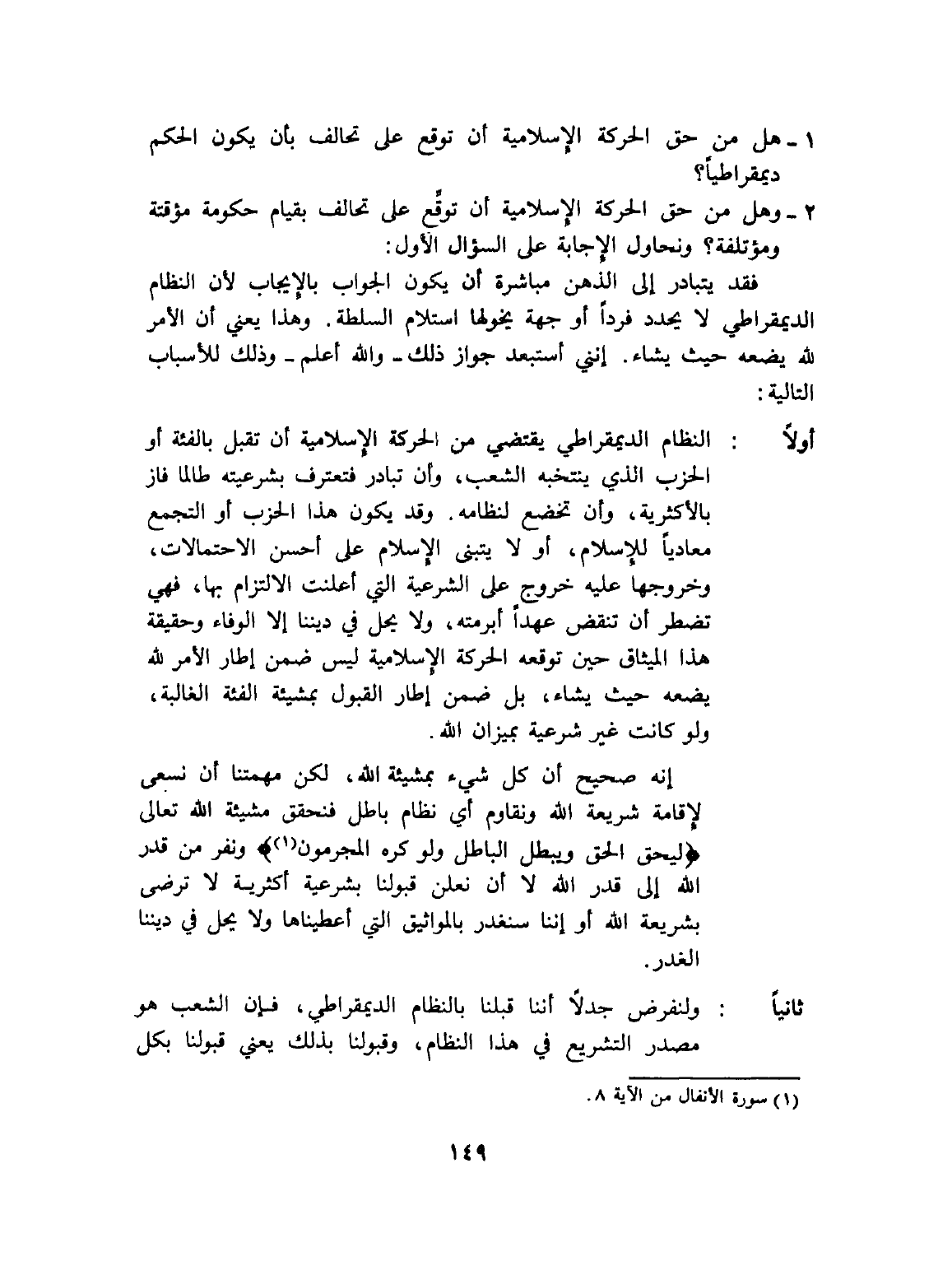 أولا: النظام الديمقراطي يقتضي من الحركة الإسلامية أن تقبل بالفئة أو الحزب الذي ينتخبه الشعب، وأن تبادر فتعترف بشرعيته طالما فاز بالأكثرية، وأن تخضع لنظامه. وقد يكون هذا الحزب أو التجمع معاديا للإسلام، أو لا يتبنى الإسلام على أحسن الاحتمالات، وخروجها عليه خروج على الشرعية التي أعلنت الالتزام بها، فهي تضطر أن تنقض عهدا أبرمته، ولا يحل في ديننا إلا الوفاء وحقيقة هذا الميثاق حين توقعه الحركة الإسلامية ليس ضمن إطار الأمر لله يضعه حيث يشاء، بل ضمن إطار القبول بمشيئة الفئة الغالبة، ولو كانت غير شرعية بميزان الله.
