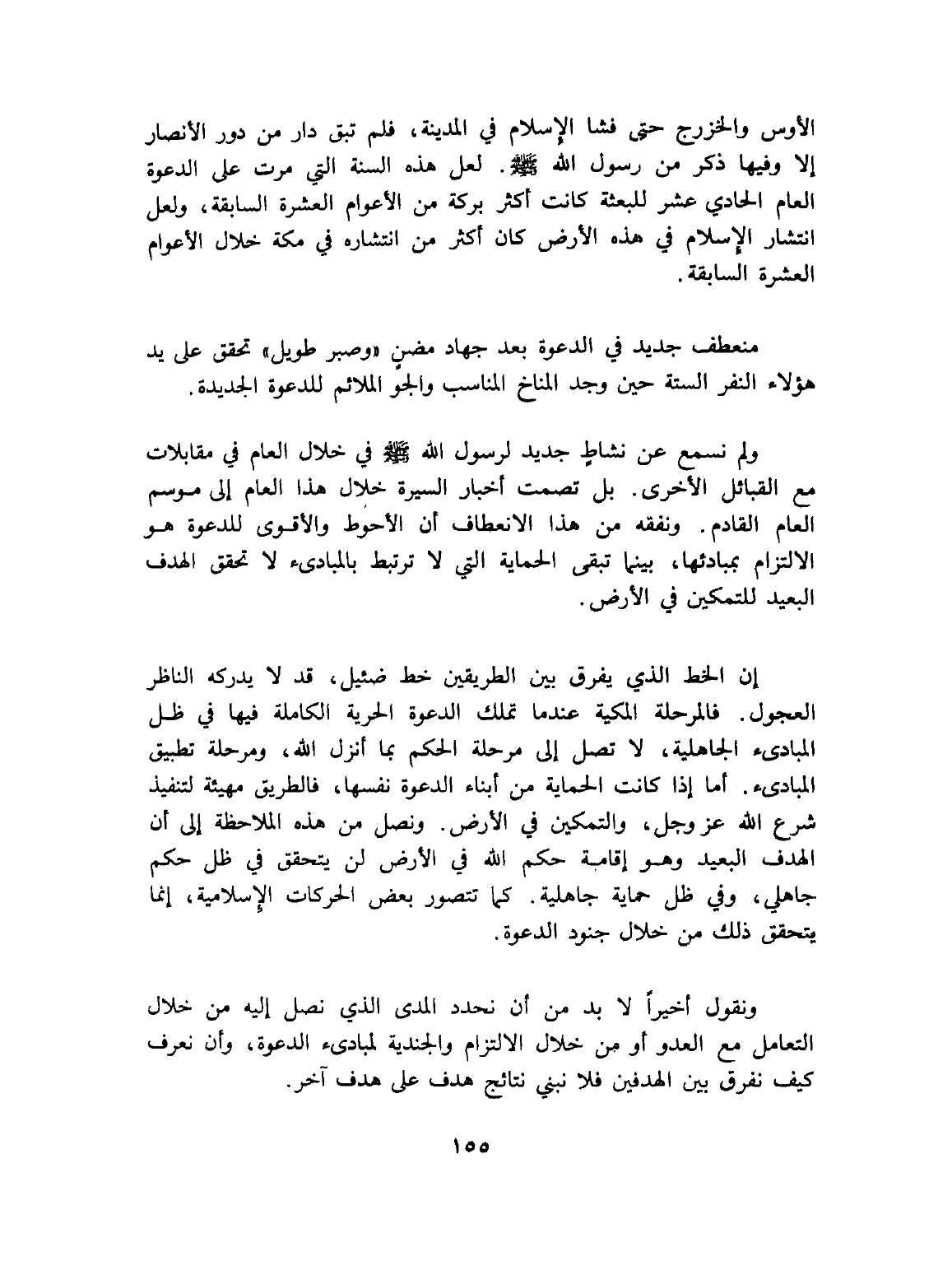 إن الخط الذي يفرق بين الطريقين خط ضئيل، قد لا يدركه الناظر العجول. فالمرحلة المكية عندما تملك الدعوة الحرية الكاملة فيها في ظل المبادىء الجاهلية، لا تصل إلى مرحلة الحكم بما أنزل الله، ومرحلة تطبيق المبادىء. أما إذا كانت الحيماية من أبناء الدعوة نفسها، فالطريق مهيئة لتنفيذ شرع الله عز وجل، والتمكين في الأرض. ونصل من هذه الملاحظة إلى أن الهدف البعيد وهو إقامة حكم الله في الأرض لن يتحقق في ظل حكم جاهلي، وفي ظل حماية جاهلية. كما تتصور بعض الحركات الإسلامية، إنما يتحقق ذلك من خلال جنود الدعوة.