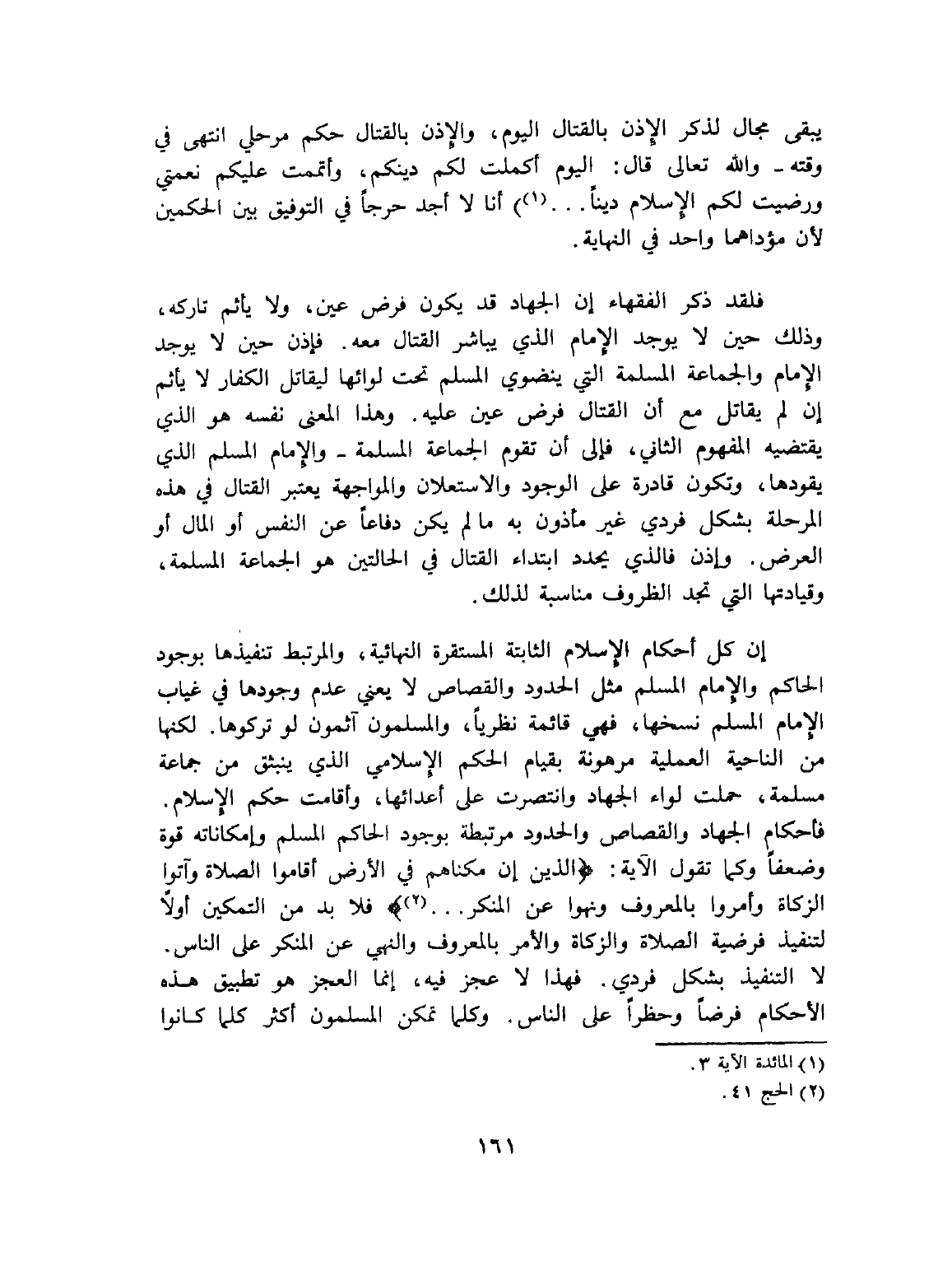 فلقد ذكر الفقهاء إن الجهاد قد يكون فرض عين، ولا يأثم تاركه، وذلك حين لا يوجد الإمام الذي يباشر القتال معه. فإذن حين لا يوجد الإمام والجماعة المسلمة التي ينضوي المسلم تحت لوائها ليقاتل الكفار لا يأثم إن لم يقاتل مع أن القتال فرض عين عليه. وهذا المعنى نفسه هو الذي يقتضيه المفهوم الثاني، فإلى أن تقرم الجماعة المسلمة - والإمام المسلم الذي يقودها، وتكون قادرة على الوجود والاستعلان والمواجهة يعتبر القتال في هذه المرحلة بشكل فردي غير مأذون به ما لم يكن دفاعا عن النفس أو المال أو العرض. وإذن فالذي يحدد ابتداء القتال في الحالتين هو الجماعة المسلمة، وقيادتها التي تجد الظروف مناسبة لذلك.