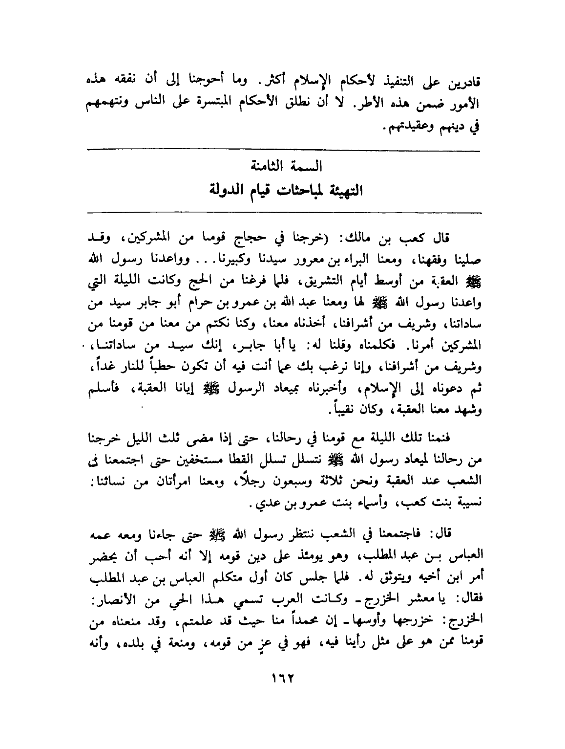 قال: فاجتمعنا في الشعب ننتظر رسول الله - صلى الله عليه وسلم - حتى جاءنا ومعه عمه العباس بن عبد المطلب، وهو يومئذ على دين قومه إلا أنه أحب أن يحضر أمر ابن أخيه ويتوثق له. فلما جلس كان أول متكلم العباس بن عبد المطلب فقال: يا معشر الخزرج - وكانت العرب تسمي هذا الحي من الأنصار: الخزرج: خزرجها وأوسها - إن محمدا منا حيث قد علمتم، وقد منعناه من قومنا ممن هو على مثل رأينا فيه، فهو في عز من قومه، ومنعة في بلده، وأنه