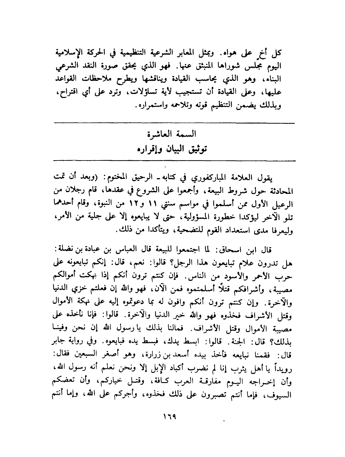 يقول العلامة المباركفوري في كتابه - الرحيق المختوم: (وبعد أن تمت المحادثة حول شروط البيعة، وأجمعوا على الشروع في عقدها، قام رجلان من الرعيل الأول ممن أسلموا في مواسم سنتي 11 و 12 من النبوة، وقام أحدهما تلو الآخر ليؤكدا خطورة المسؤولية، حتى لا يبايعوه إلا على جلية من الأمر، وليعرفا مدى استعداد القوم للتضحية، ويتأكدا من ذلك.