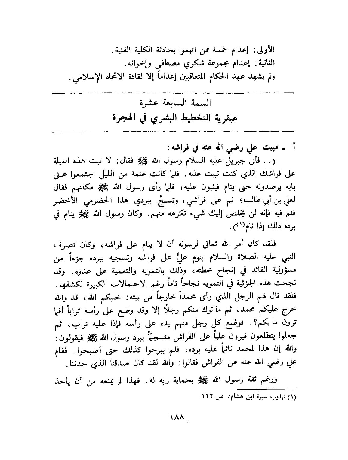 (.. فأتى جبريل عليه السلام رسول الله - صلى الله عليه وسلم - فقال: لا تبت هذه الليلة على فراشك الذي كنت تبيت عليه. فلما كانت عتمة من الليل اجتمعوا على بابه يرصدونه حتى ينام فيثبون عليه، فلما رأى رسول الله - صلى الله عليه وسلم - مكانهم فقال لعلي بن أبي طالب، نم على فراشي، وتسج ببردي هذا الحضرمي الأخضر فنم فيه فإنه لن يخلص إليك شيء تكرهه منهم. وكان رسول الله - صلى الله عليه وسلم - ينام في برده ذلك إذا نام (¬1)).