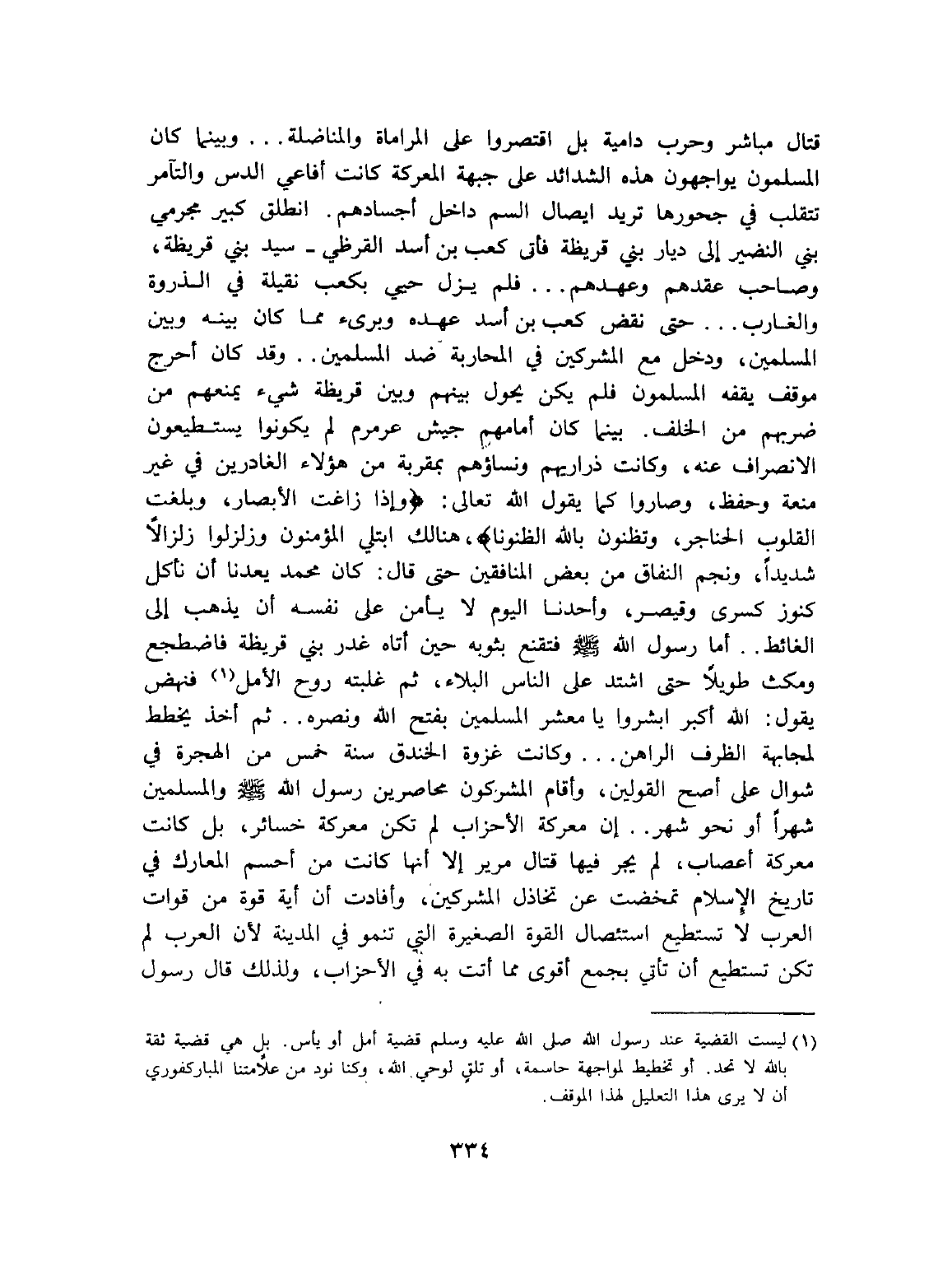 (¬1) ليست القضية عند رسول الله صلى الله عليه وسلم قضية أمل أو يأس. بل هي قضية ثقة بالله لا تحد. أو تخطيط لمواجهة حاسمة، أو تلق لوحي الله، وكنا نود من علامتنا المباركفوري أن لا يرى هذا التعليل لهذا الموقف.
