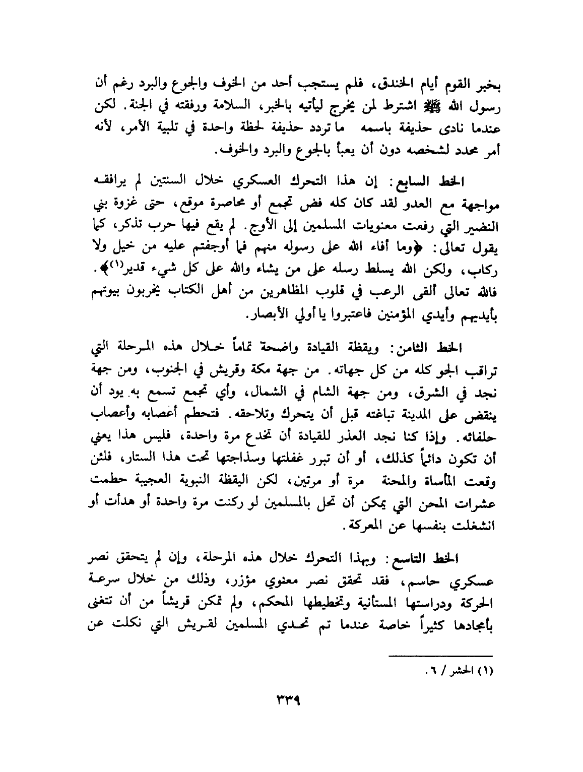 الخط التاسع: وبهذا التحرك خلال هذه المرحلة، وإن لم يتحقق نصر عسكري حاسم، فقد تحقق نصر معنوي مؤزر، وذلك من خلال سرعة الحركة ودراستها المستأنية وتخطيطها المحكم، ولم تمكن قريشا من أن تتغنى بأمجادها كثيرا خاصة عندما تم تحدي المسلمين لقريش التي نكلت عن
