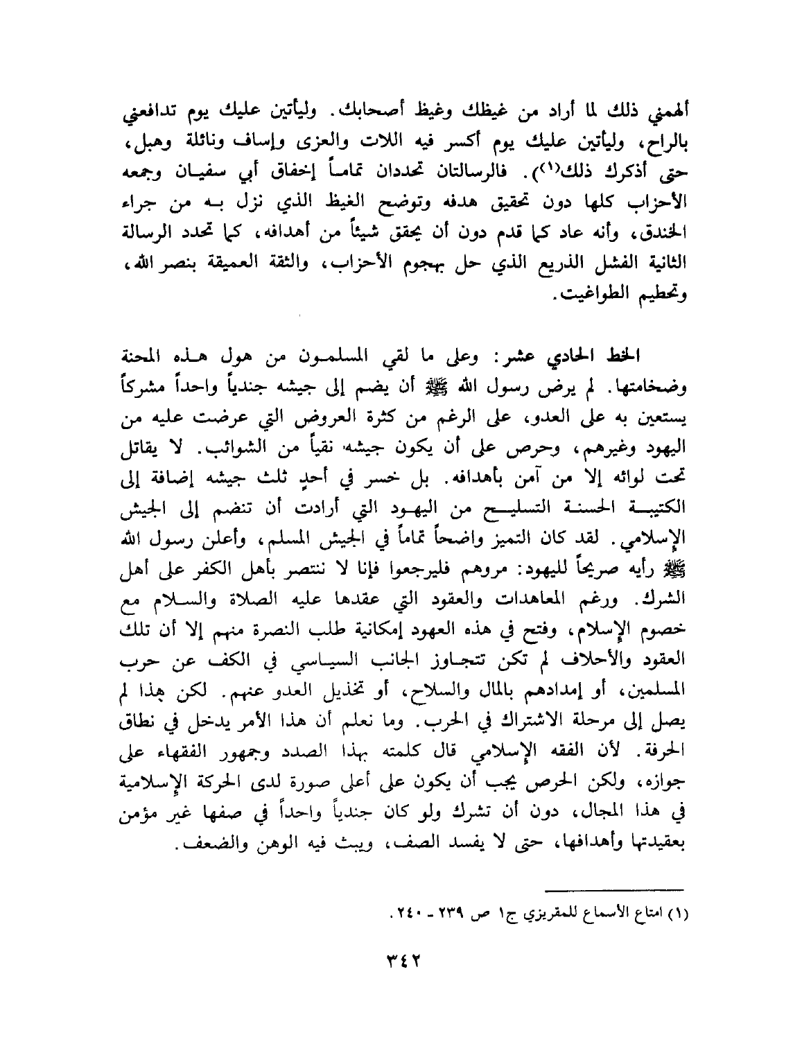 الهمني ذلك لما أراد من غيظك وغيظ أصحابك. وليأتين عليك يوم تدافعني بالراح، وليأتين عليك يوم أكسر فيه اللات والعزى وإساف ونائلة وهبل، حتى أذكرك ذلك (¬1)). فالرسالتان تحددان تماما إخفاق أبي سفيان وجمعه الأحزاب كلها دون تحقيق هدفه وتوضح الغيظ الذي نزل به من جراء الخندق، وأنه عاد كما قدم دون أن يحقق شيئا من أهدافه، كما تحدد الرسالة الثانية الفشل الذريع الذي حل بهجوم الأحزاب، والثقة العميقة بنصر الله، وتحطيم الطواغيت.