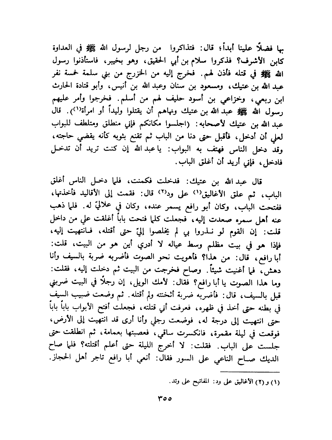 بها فضلا علينا أبدا، قال: فتذاكروا من رجل لرسول الله - صلى الله عليه وسلم - في العداوة كابن الأشرف؟ فذكروا سلام بن أبي الحقيق، وهو بخيبر، فاستأذنوا رسول الله - صلى الله عليه وسلم - في قتله فأذن لهم. فخرج إليه من الخزرج من بني سلمة خمسة نفر عبد الله بن عتيك، ومسعود بن سنان وعبد الله بن أنيس، وأبو قتادة الحارث ابن ربعي، وخزاعي بن أسود حليف لهم من أسلم. فخرجوا وأمر عليهم رسول الله - صلى الله عليه وسلم - عبد الله بن عتيك ونهاهم أن يقتلوا وليدا أو امرأة). قال عبد الله بن عتيك لأصحابه: (اجلسوا مكانكم فإني منطلق ومتلطف للبواب لعلي أن أدخل، فأقبل حتى دنا من الباب ثم تقنع بثوبه كأنه يقضي حاجته، وقد دخل الناس فهتف به البواب: يا عبد الله إن كنت تريد أن تدخل فادخل، فإني أريد أن أغلق الباب.