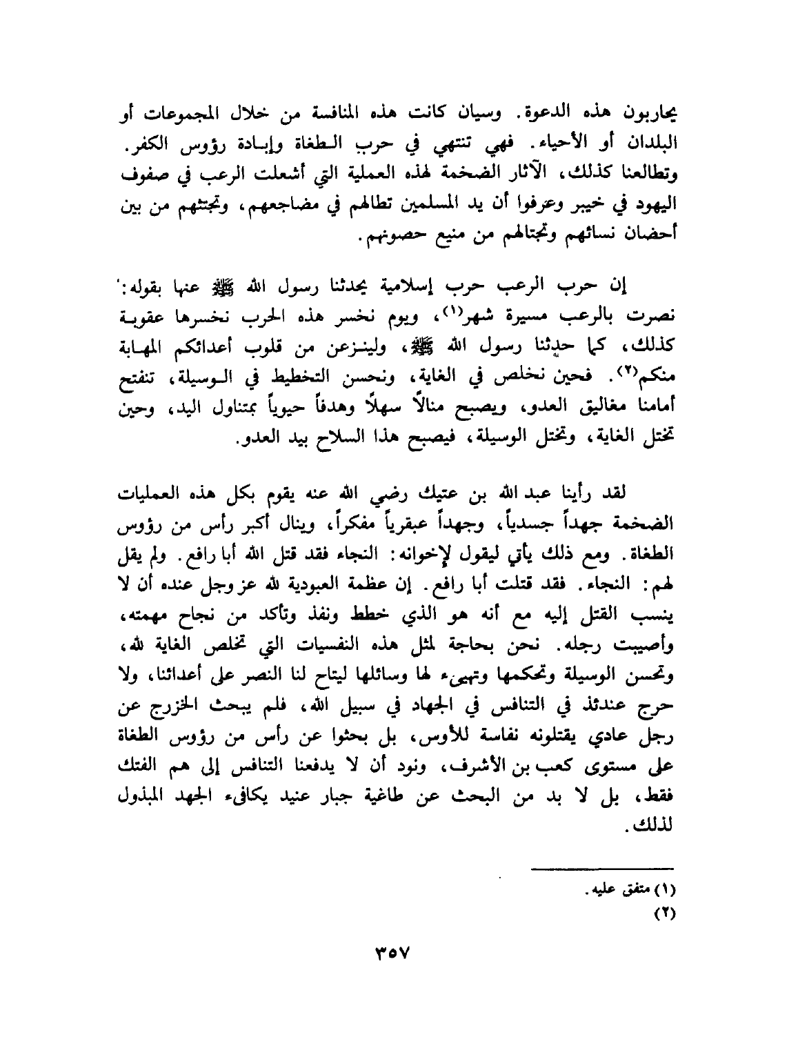 يحاربون هذه الدعوة. وسيان كانت هذه المنافسة من خلال المجموعات أو البلدان أو الأحياء. فهي تنتهي في حرب الطغاة وإبادة رؤوس الكفر. وتطالعنا كذلك، الآثار الضخمة لهذه العملية التي أشعلت الرعب في صفوف اليهود في خيبر وعرفوا أن يد المسلمين تطالهم في مضاجعهم، وتجتثهم من بين أحضان نسائهم وتجتالهم من منيع حصونهم.