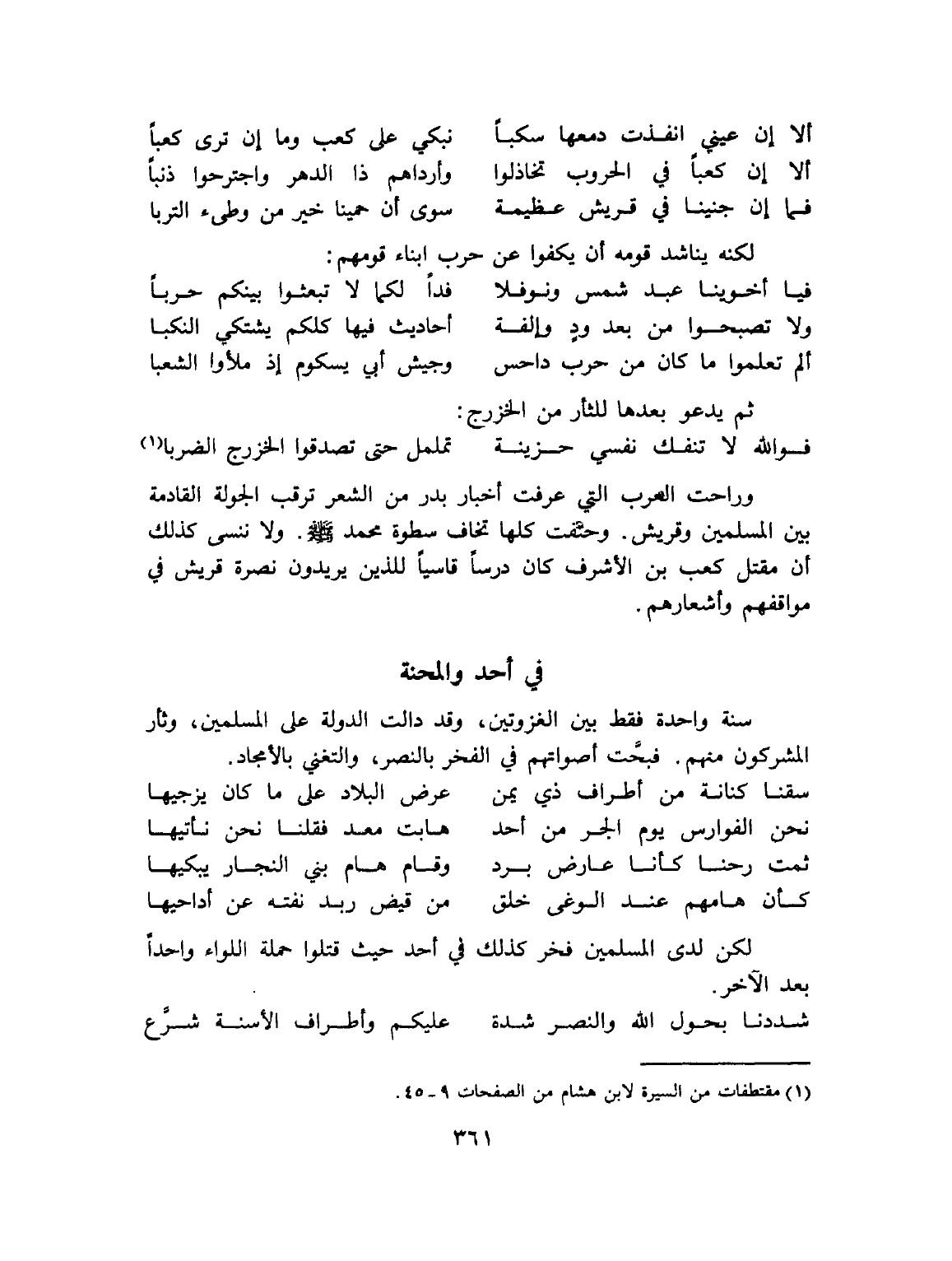 وراحت العرب التي عرفت أخبار بدر من الشعر ترقب الجولة القادمة بين المسلمين وقريش. وحتفت كلها تخاف سطوة محمد - صلى الله عليه وسلم -. ولا ننسى كذلك أن مقتل كعب بن الأشرف كان درسا قاسيا للذين يريدون نصرة قريش في مواقفهم وأشعارهم.