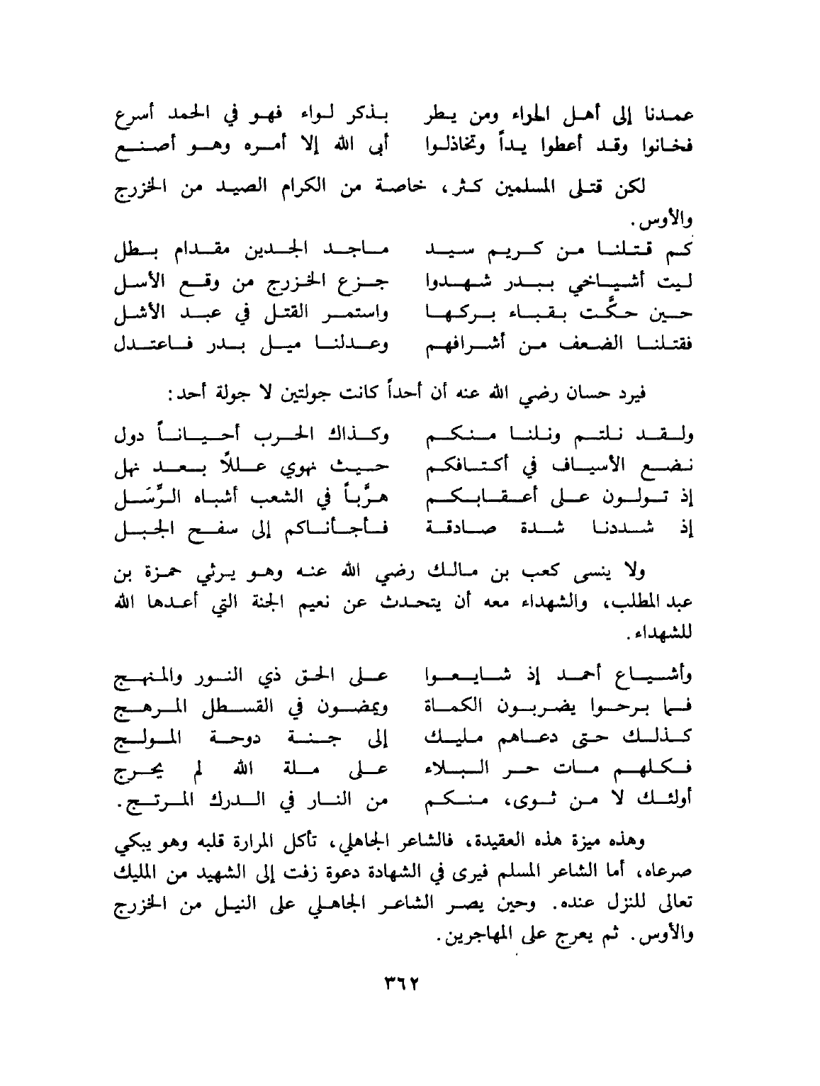 وهذه ميزة هذه العقيدة، فالشاعر الجاهلي، تأكل المرارة قلبه وهو يبكي صرعاه، أما الشاعر المسلم فيرى في الشهادة دعوة زفت إلى الشهيد من المليك تعالى للنزل عنده. وحين يصر الشاعر الجاهلي على النيل من الخزرج والأوس. ثم يعرج على المهاجرين.