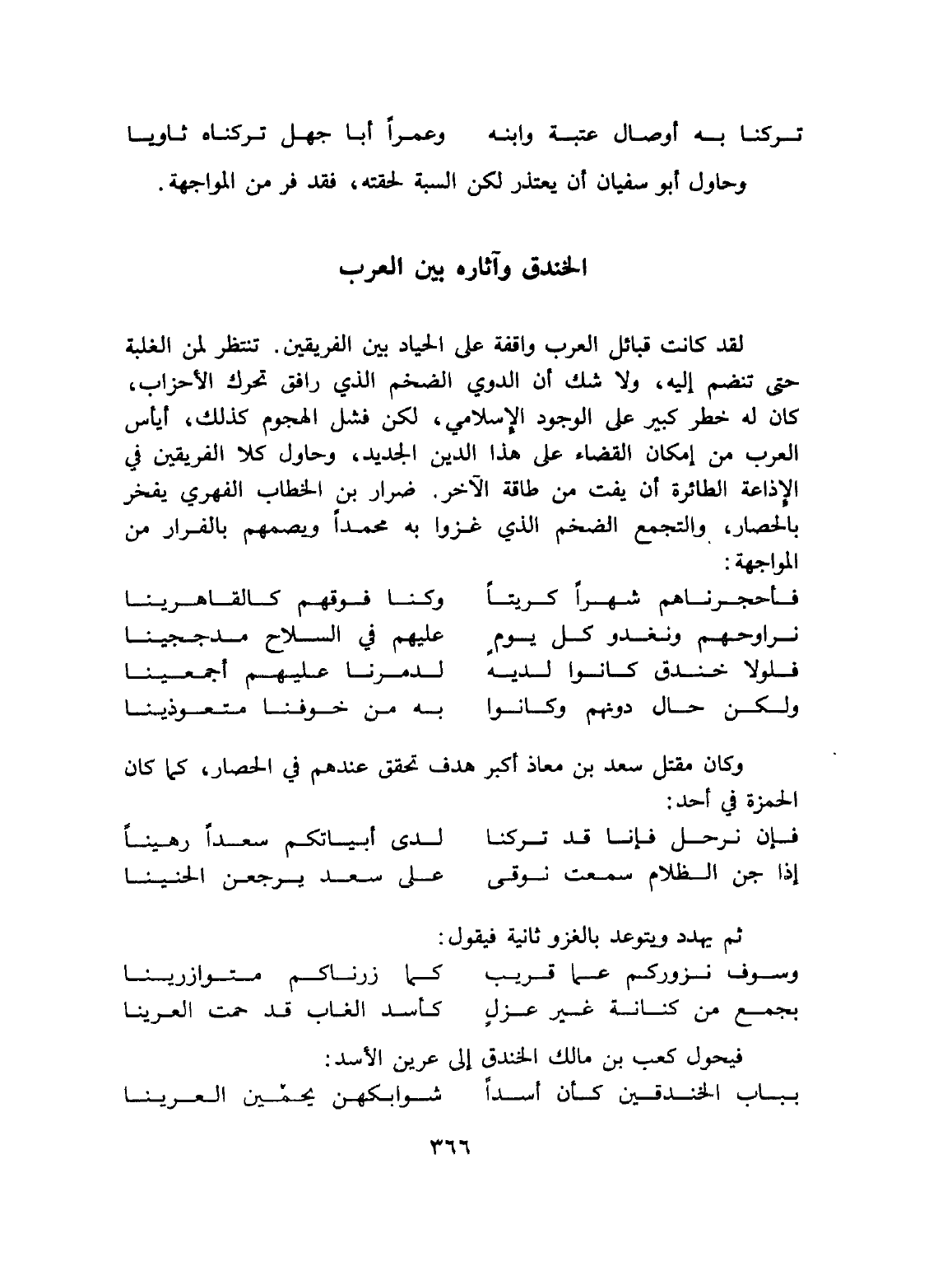 لقد كانت قبائل العرب واقفة على الحياد بين الفريقين. تنتظر لمن الغلبة حتى تنضم إليه، ولا شك أن الدوي الضخم الذي رافق تحرك الأحزاب، كان له خطر كبير على الوجود الإسلامي، لكن فشل الهجوم كذلك، أيأس العرب من إمكان القضاء على هذا الدين الجديد، وحاول كلا الفريقين في الإذاعة الطائرة أن يفت من طافة الآخر، ضرار بن الخطاب الفهري يفخر بالحصار، والتجمع الضخم الذي غزوا به محمدا ويصمهم بالفرار من المواجهة: