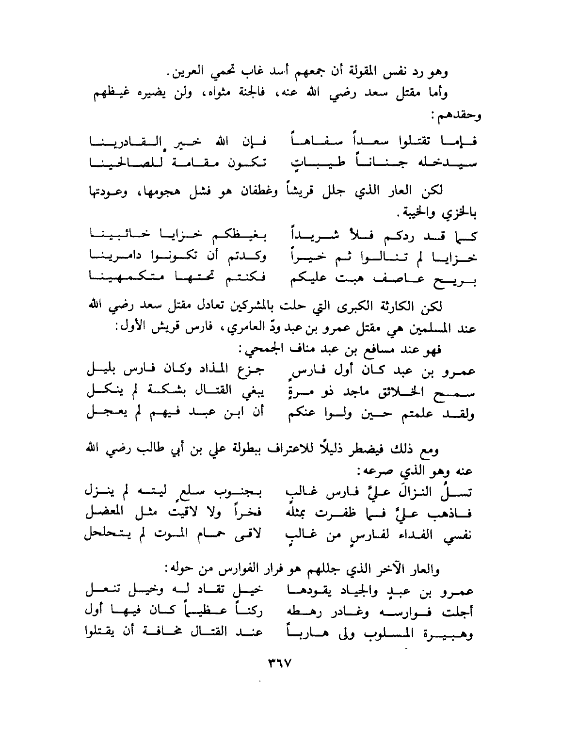 لكن الكارثة الكبرى التي حلت بالمشركين تعادل مقتل سعد رضي الله عند المسلمين هي مقتل عمرو بن عبد ود العامري، فارس قريش الأول: