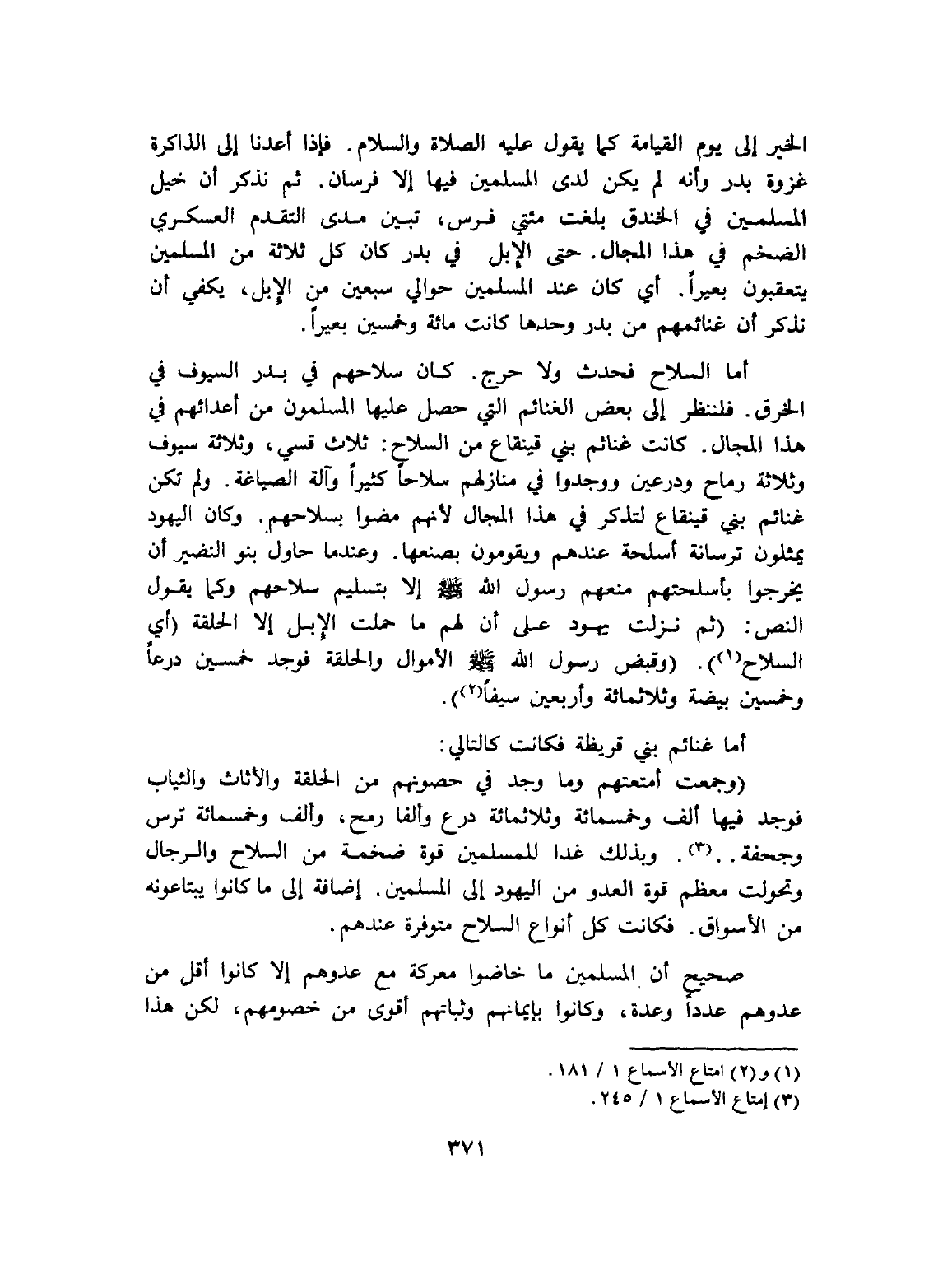 الخير إلى يوم القيامة كما يقول عليه الصلاة والسلام. فإذا أعدنا إلى الذاكرة غزوة بدر وأنه لم يكن لدى المسلمين فيها إلا فرسان. ثم نذكر أن خيل المسلمين في الخندق بلغت مئتي فرس، تبين مدى التقدم العسكري الضخم في هذا المجال. حتى الإبل في بدر كان كل ثلاثة من المسلمين يتعقبون بعيرا. أي كان عند المسلمين حوالي سبعين من الإبل، يكفي أن نذكر أن غنائمهم من بدر وحدها كانت مائة وخمسين بعيرا.