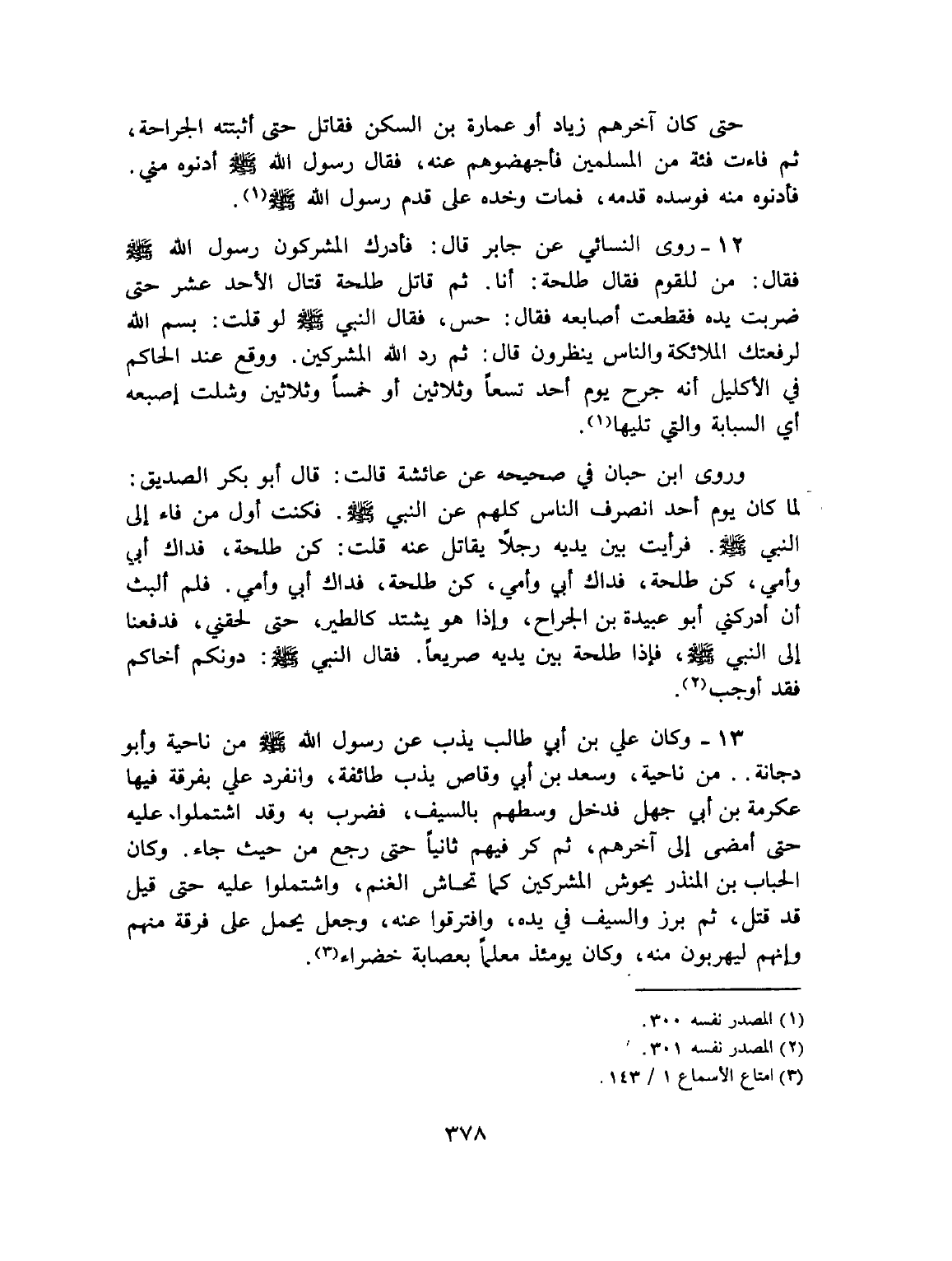 12 - روى النسائي عن جابر قال: فأدرك المشركون رسول الله - صلى الله عليه وسلم - فقال: من للقوم فقالط طلحة: أنا. ثم قاتل طلحة قتال الأحد عشر حتى ضربت يده فقطعت أصابعه فقال: حس، فقال النبي - صلى الله عليه وسلم - لو قلت: بسم الله لرفعتك الملائكة والناس ينظرون قال: ثم رد الله المشركين. ووقع عند الحاكم في الأكليل أنه جرح يوم أحد تسعا وثلاثين أو خمسا وثلاثين وشلت إصبعه أي السبابة والتي تليها (1).
