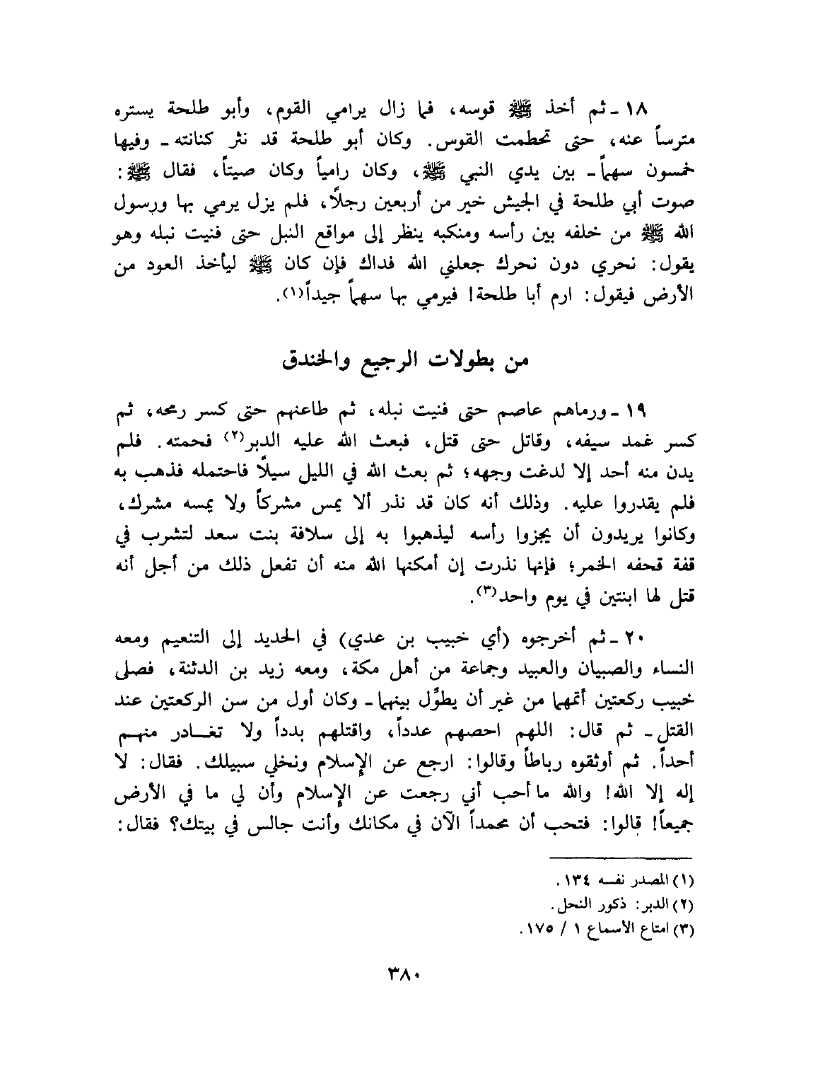18 - ثم أخذ - صلى الله عليه وسلم - قوسه، فما زال يرامي القوم، وأبو طلحة يستره مترسا عنه، حتى تحطمت القوس. وكان أبو طلحة قد نثر كنانته - وفيها خمسون سهما - بين يدي النبي - صلى الله عليه وسلم -، وكان راميا وكان صيتا، فقال - صلى الله عليه وسلم -: صوت أبي طلحة في الجيش خير من أربعين رجلا، فلم يزل يرمي بها ورسول الله - صلى الله عليه وسلم - من خلفه بين رأسه ومنكبه ينظر إلى مواقع النبل حتى فنيت نبله وهو يقول: نحري دون نحرك جعلني الله فداك فإن كان - صلى الله عليه وسلم - ليأخذ العود من الأرض فيقول: ارم أبا طلحة! فيرمي بها سهما جيدا (¬1).