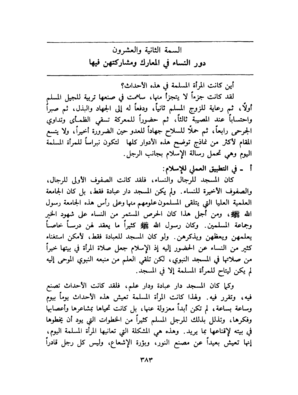 وكما كان المسجد دار عبادة ودار علم، فلقد كانت الأحداث تصنع فيه، وتقرر فيه. ولهذا كانت المرأة المسلمة تعيش هذه الأحداث يوما بيوم وساعة بساعة، لم تكن أبدا معزولة عنها، بل كانت تحياها بمشاعرها وأعصابها وفكرها، وتذلل بذلك للرجل المسلم كثيرا من الخطوات التي يود أن يخطوها في بيته لإقناعها بما يريد. وهذه هي المشكلة التي تعانيها المرأة المسلمة اليوم، إنها تعيش بعيدا عن مصنع النور، وبؤرة الإشعاع، وليس كل رجل قادرا