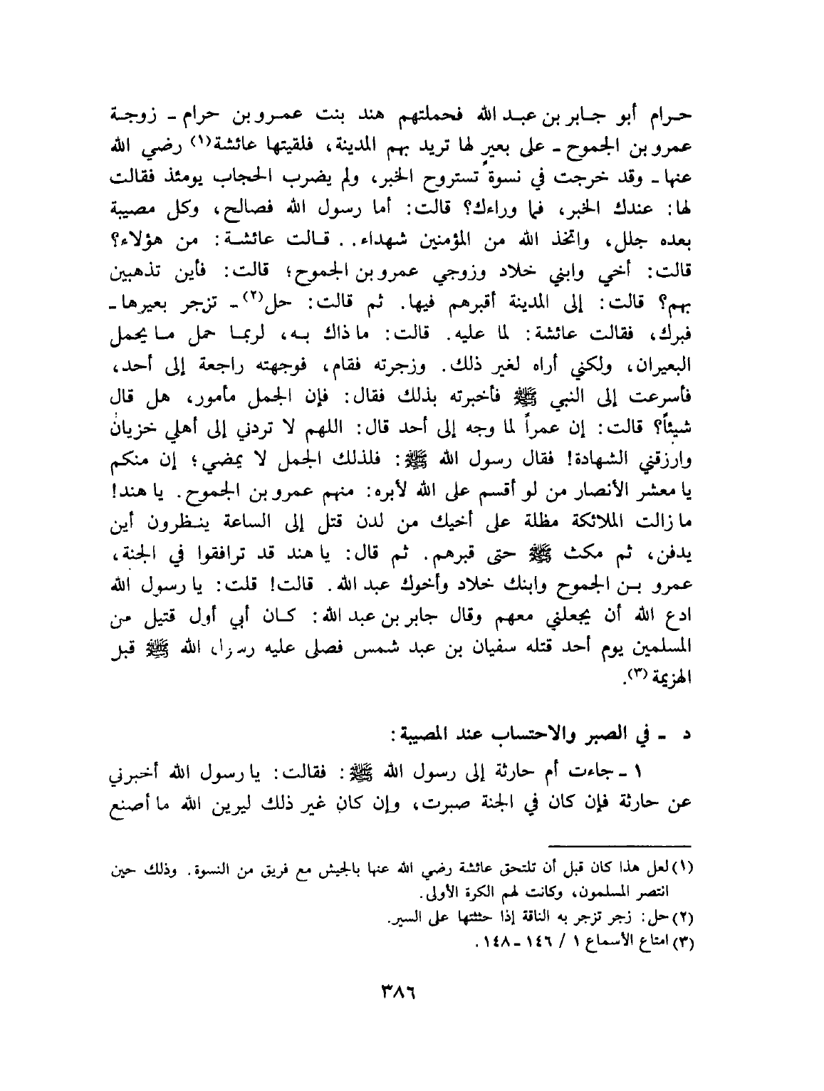 (¬1) لعل هذا كان قبل أن تلتحق عائشة رضي الله عنها بالجيش مع فريق من النسوة. وذلك حين انتصر المسلمون، وكانت لهم الكرة الأولى.