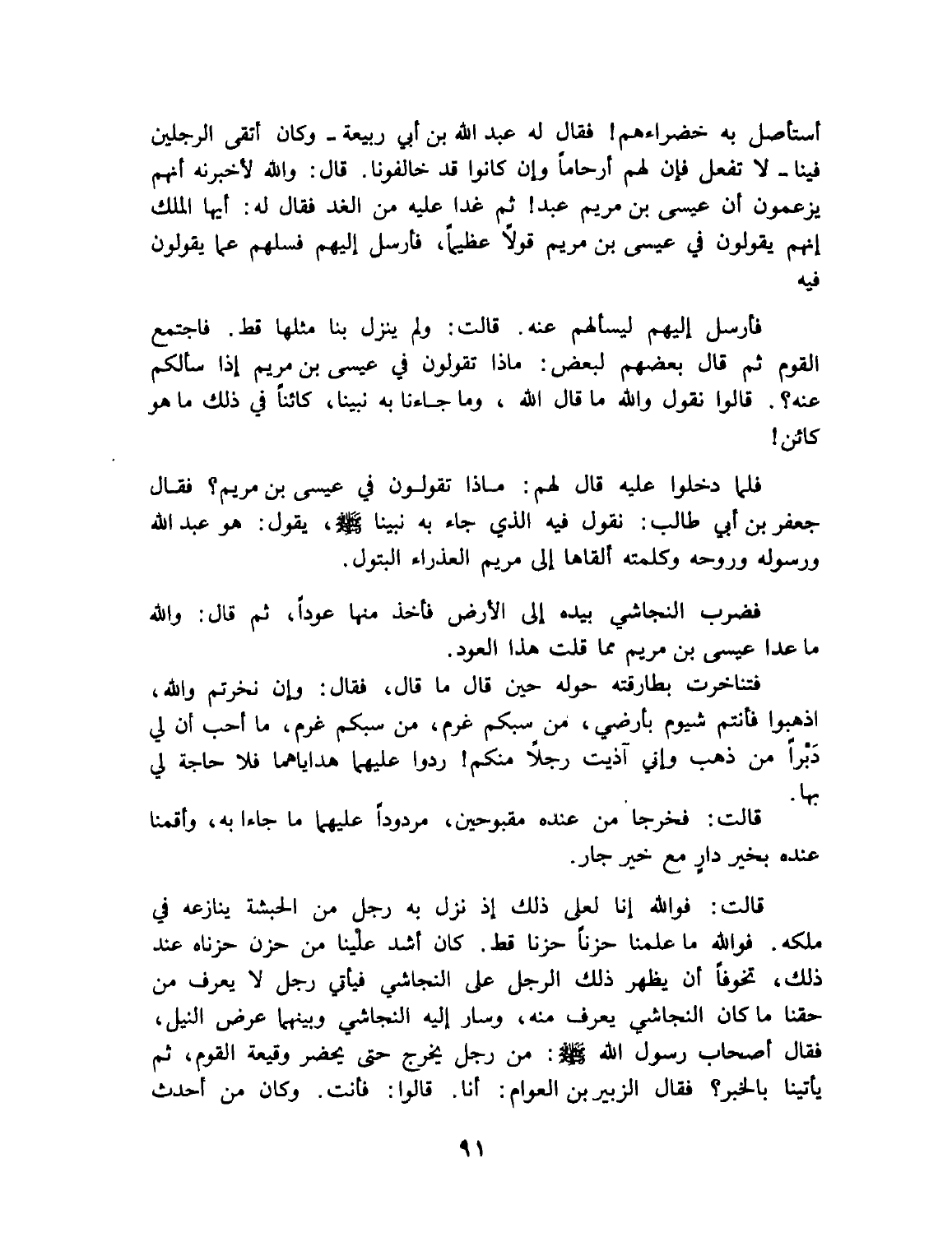 فلما دخلوا عليه قال لهم: ماذا تقولون في عيسى بن مريم؟ فقال جعفر بن أبي طالب: نقول فيه الذي جاء به نبينا - صلى الله عليه وسلم -، يقول: هو عبد الله ورسوله وروحه وكلمته ألقاها إلى مريم العذراء البتول.