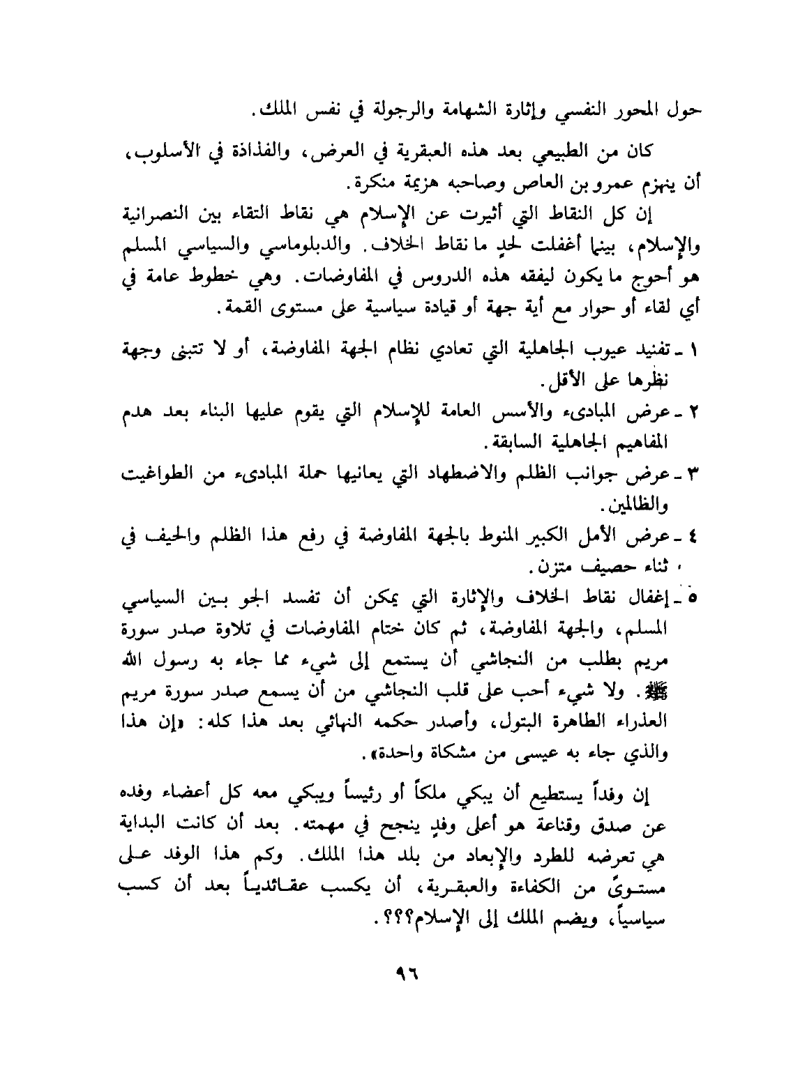 إن وفدا يستطيع أن يبكي ملكا أو رئيسا ويبكي معه كل أعضاء وفده عن صدق وقناعة هو أعلى وفد ينجح في مهمته. بعد أن كانت البداية هي تعرضه للطرد والإبعاد من بلد هذا الملك. وكم هذا الوفد على مستوى من الكفاءة والعبقرية، أن يكسب عقائديا بعد أن كسب سياسيا، ويضم الملك إلى الإسلام؟؟؟.