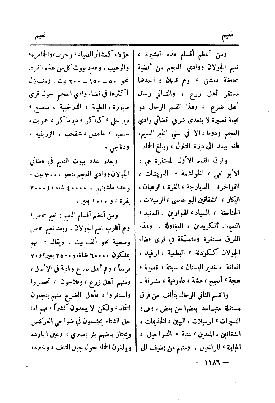 ومن أعظم أقسام هذه العشيرة، نعيم الجولان ووادي العجم من أقضية محافظة دمشق، وهم قسمان: أحدهما مستقر أهل زرع، والثاني رحال أهل ضرع، وهذا القسم الرحال ذو نجعة قصيرة لا يتعدى شرقي قضائي وادي العجم ودوما، الا في سني الخير العميم، فانه يبعد الى ديرة التلول، ويبلغ الحماد.